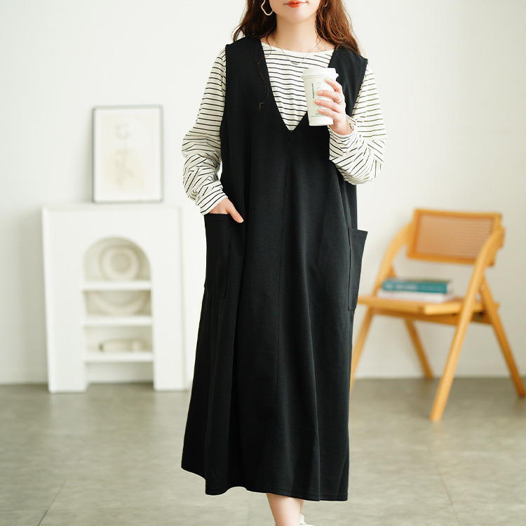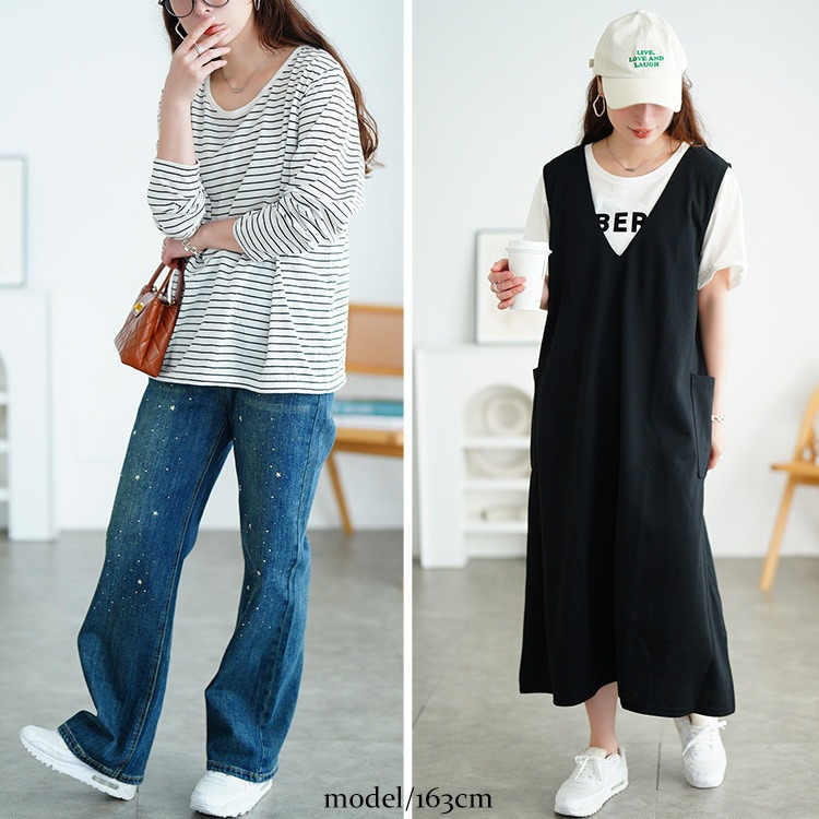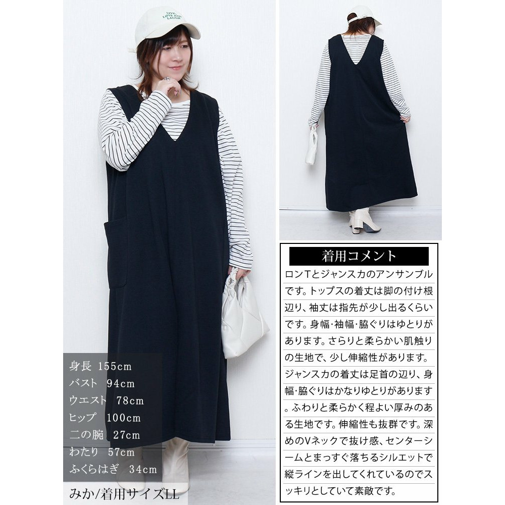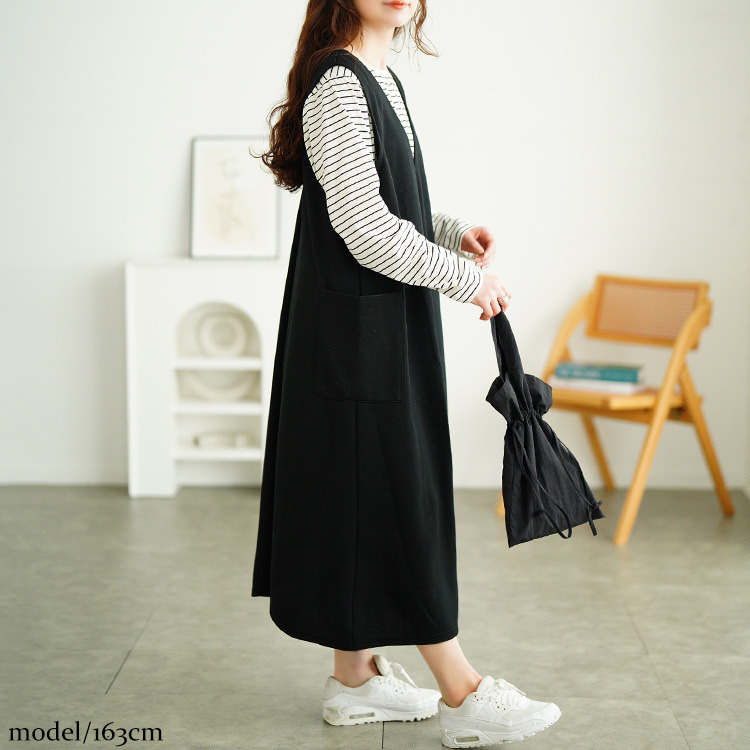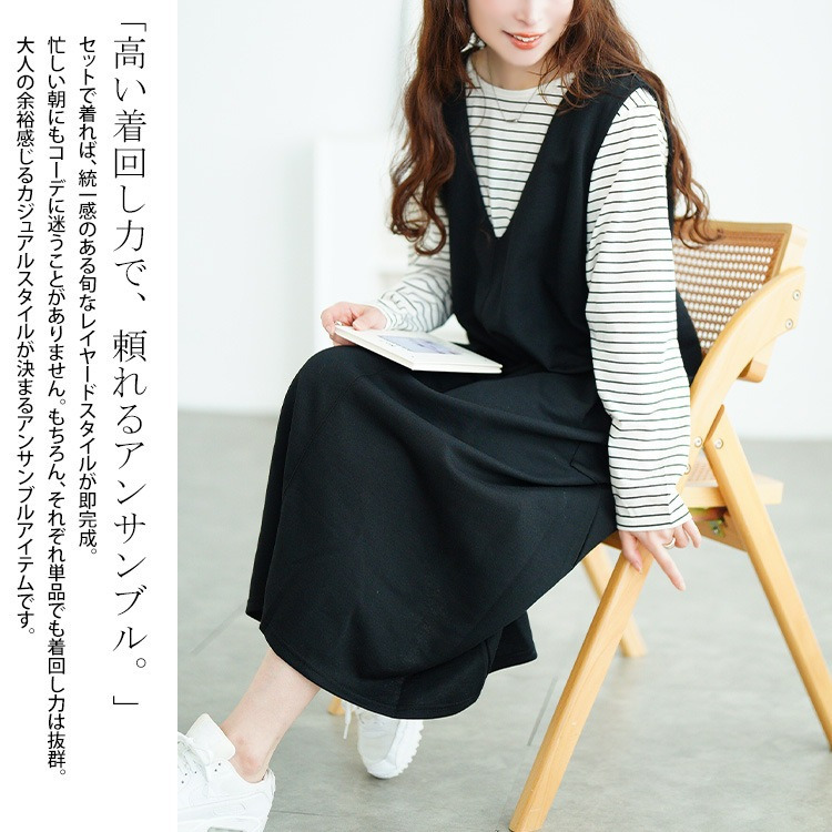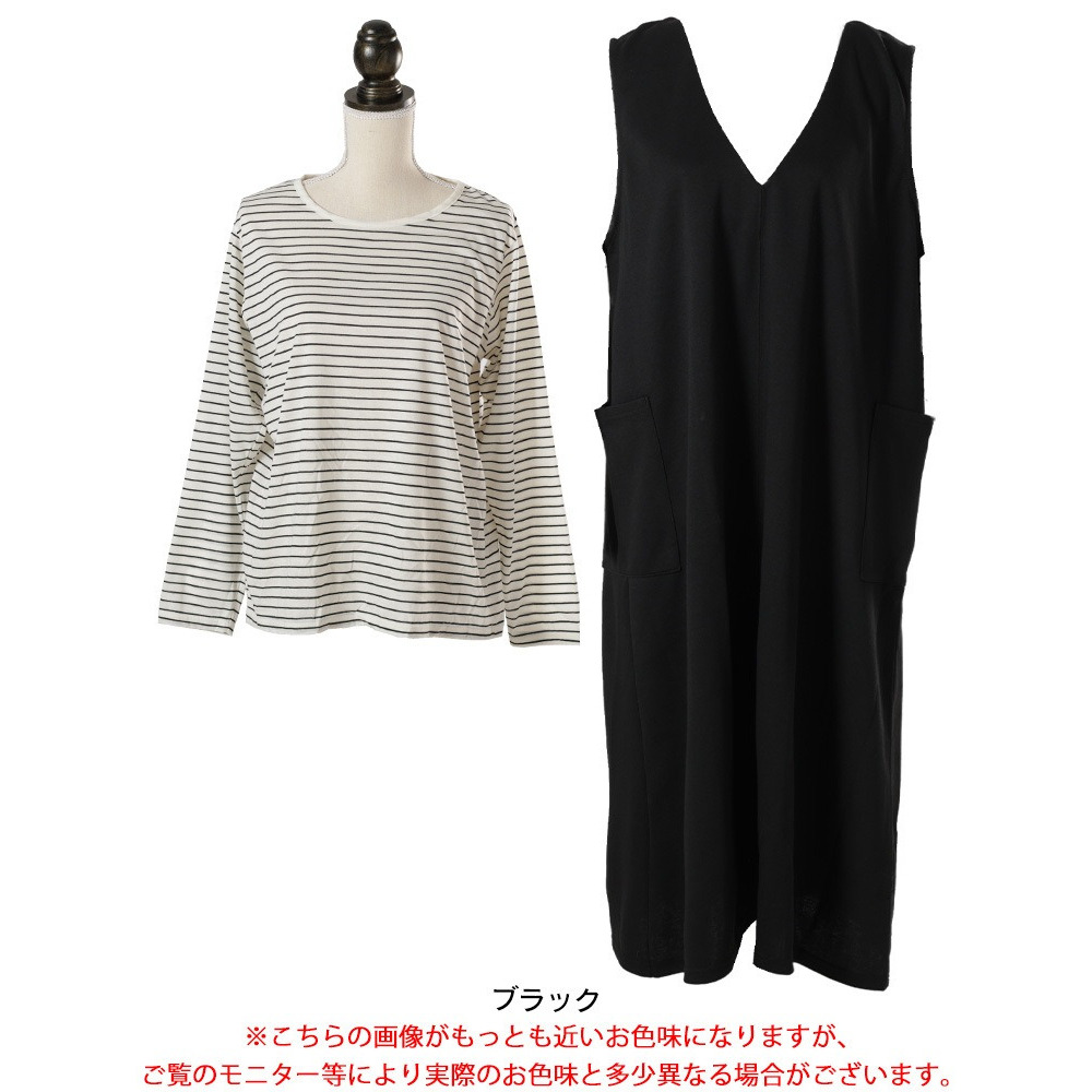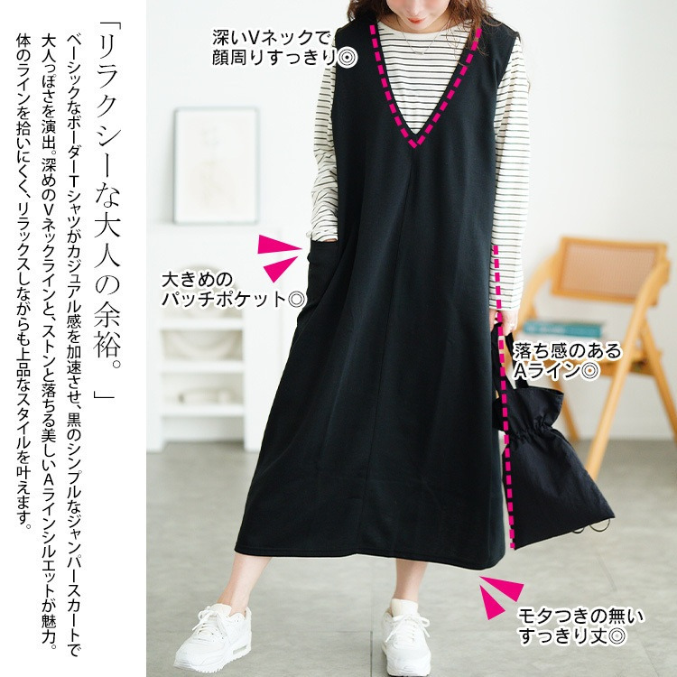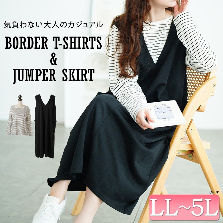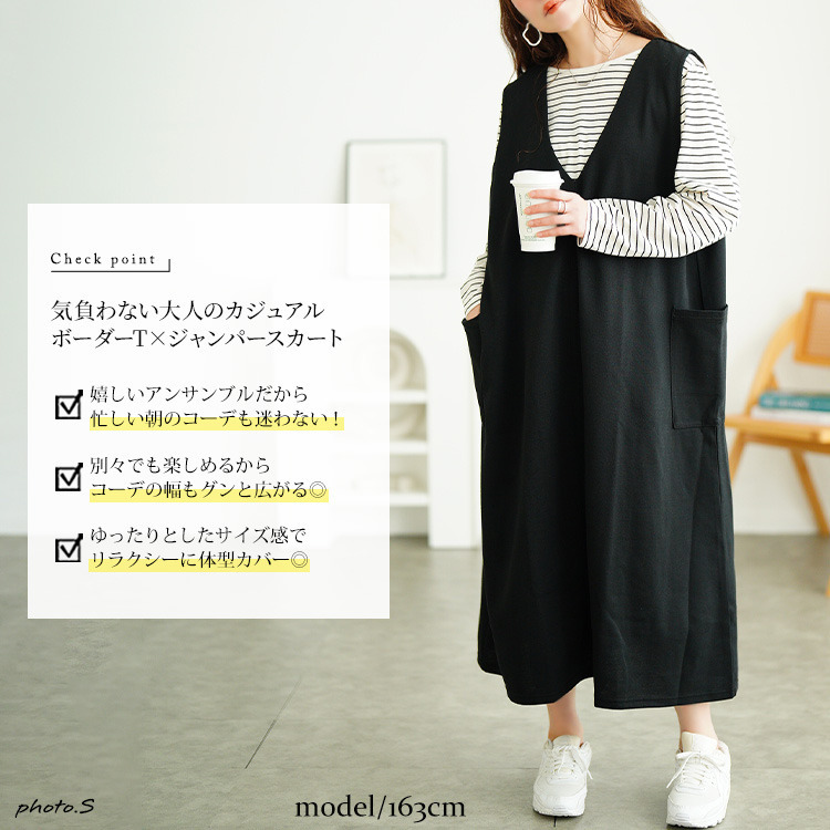 ベーシックなボーダーTシャツがカジュアル感を加速させ、黒のシンプルなジャンパースカートで大人っぽさを演出。