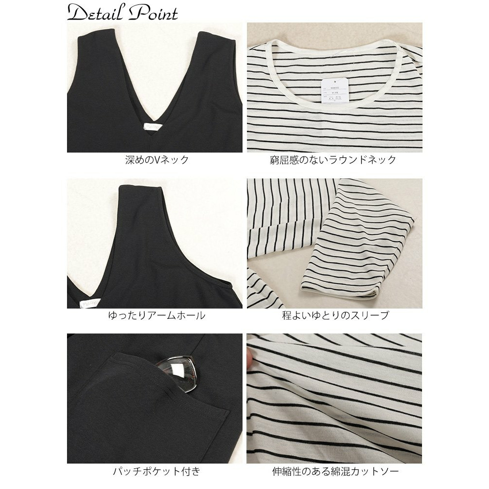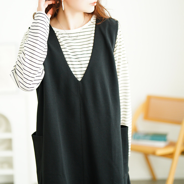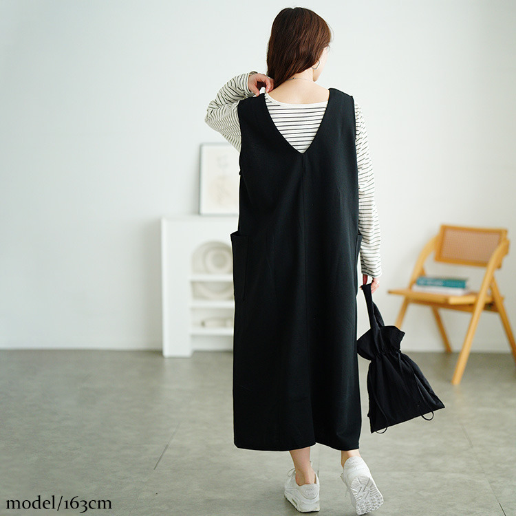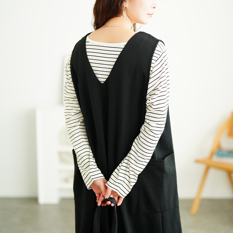 深めのVネックラインと、ストンと落ちる美しいAラインシルエットが魅力。体のラインを拾いにくく、リラックスしながらも上品なスタイルに。