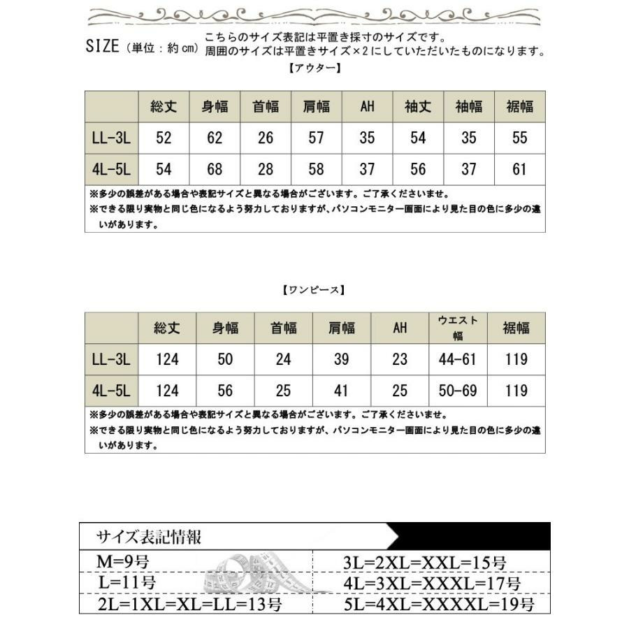 サイズ表記 LL-3L 4L-5L アウター 52cm 54cm 身幅 50cm 56cm 肩幅 39cm 41cm AH 23cm 25cm 袖丈 54cm 56cm 裾幅 119cm 119cm ワンピース LL-3L総丈 4L-5L総丈 身幅 50cm 56cm 肩幅 39cm 41cm AH 23cm 25cm 裾幅 119cm 119cm
