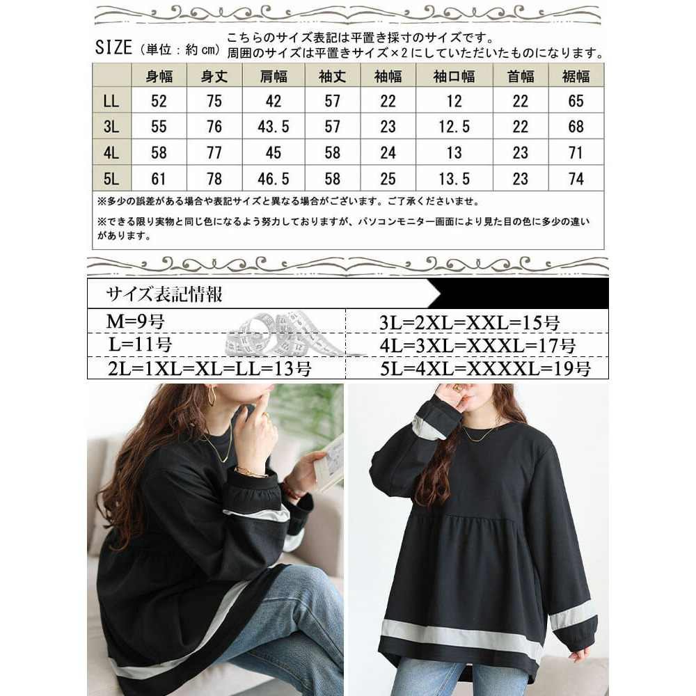 サイズ表記 LL 3L 4L 身幅 52cm 55cm 58cm 身丈 75cm 76cm 77cm 肩幅 42cm 43.5cm 45cm 袖丈 57cm 57cm 58cm 袖幅 22cm 23cm 24cm 袖口幅 12cm 12.5cm 13cm 首幅 22cm 22cm 23cm 裾幅 65cm 68cm 71cm