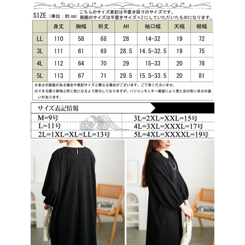 サイズ表記 LL 3L 4L 5L 身丈 110cm 111cm 112cm 113cm 胸幅 58cm 61cm 64cm 67cm 裄丈 68cm 69cm 70cm 71cm アームホール 28cm 28.5cm 29cm 29.5cm 袖口幅 14-32cm 14.5-32.5cm 15-33cm 15.5-33.5cm 天幅 19cm 19cm 20cm 20cm 裾幅 72cm 75cm 78cm 81cm