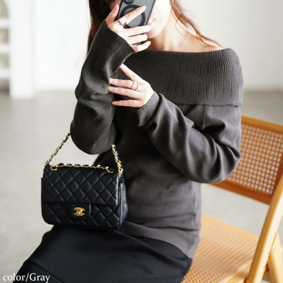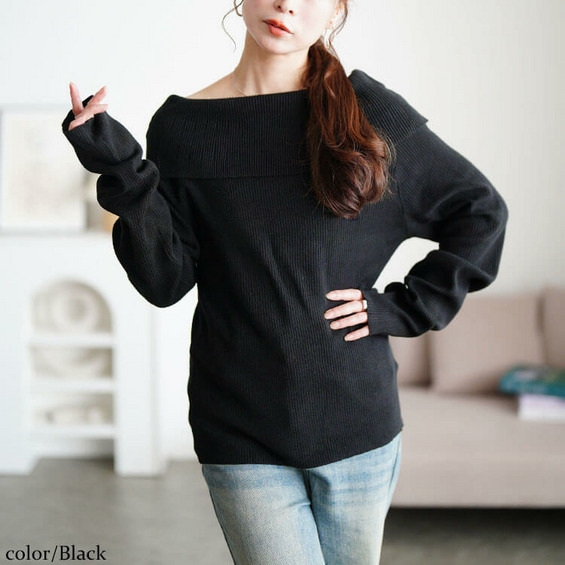 お顔まわりをスッキリ見せるオフショルダーと折り返しデザインで小顔&華奢見え効果抜群!