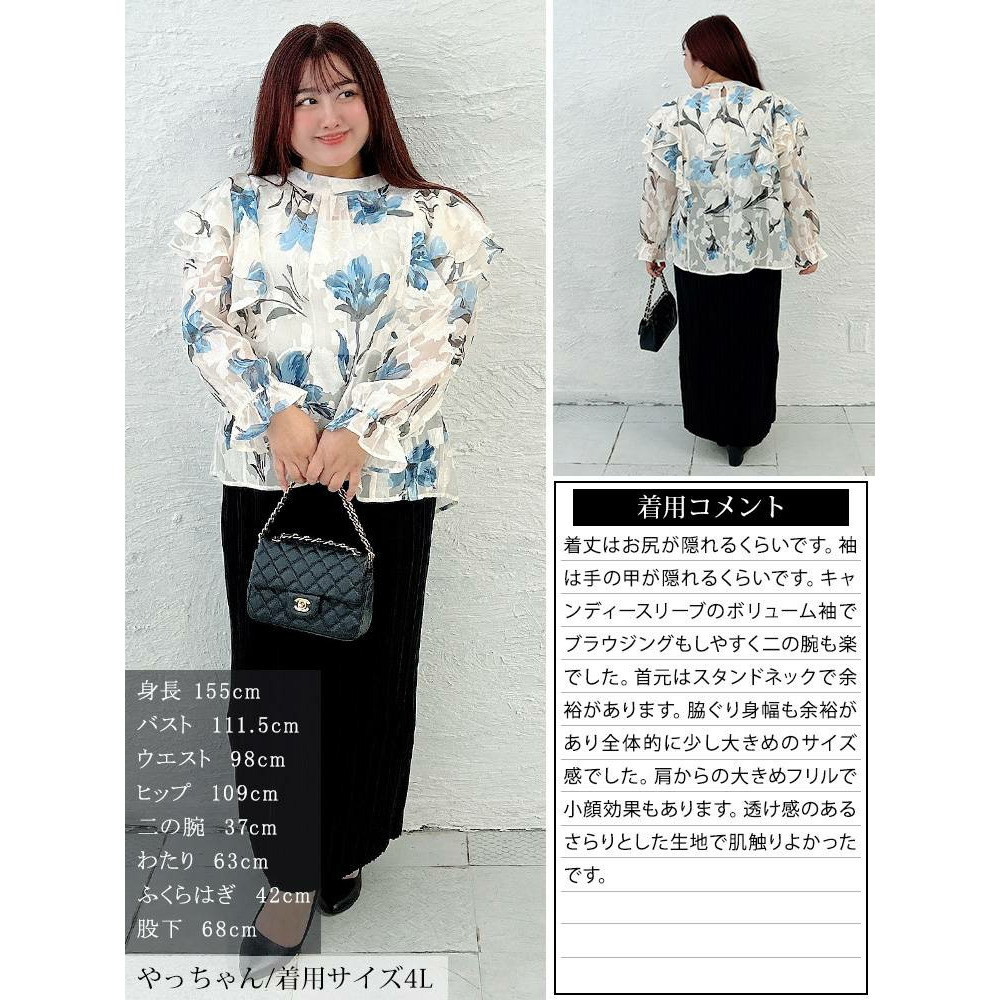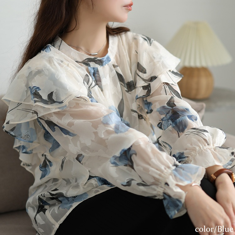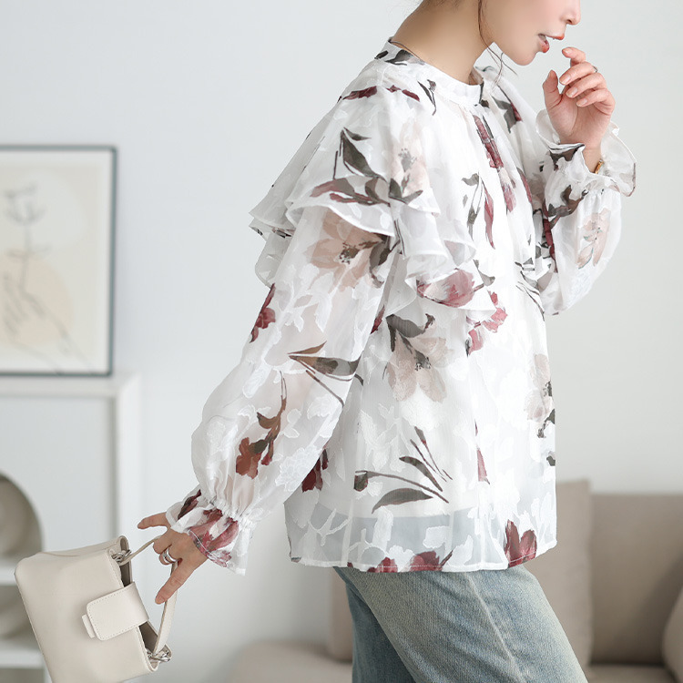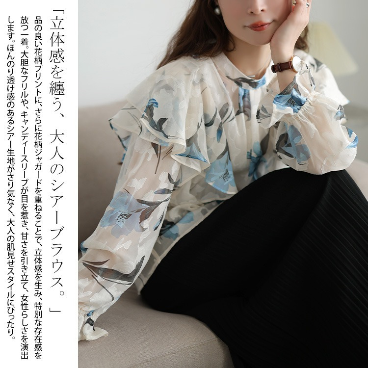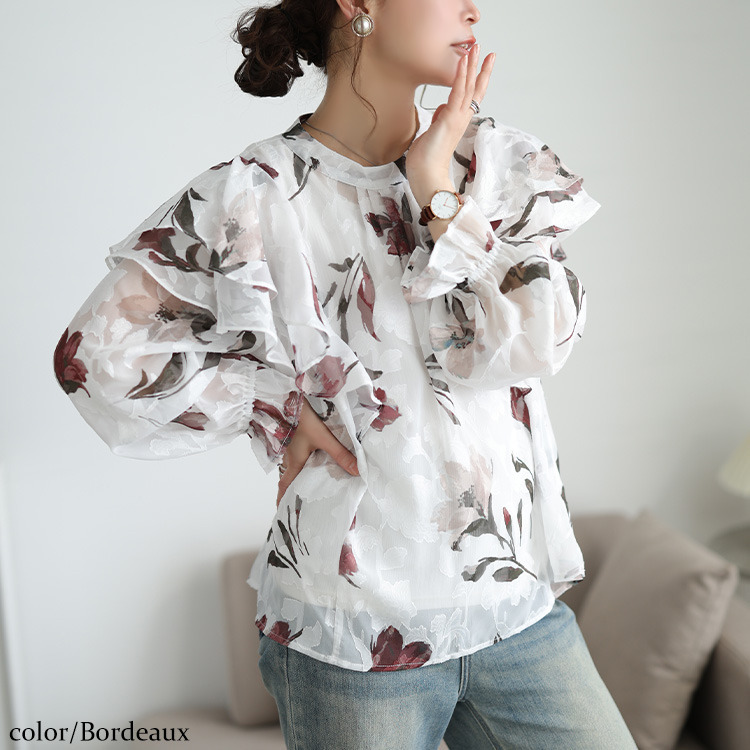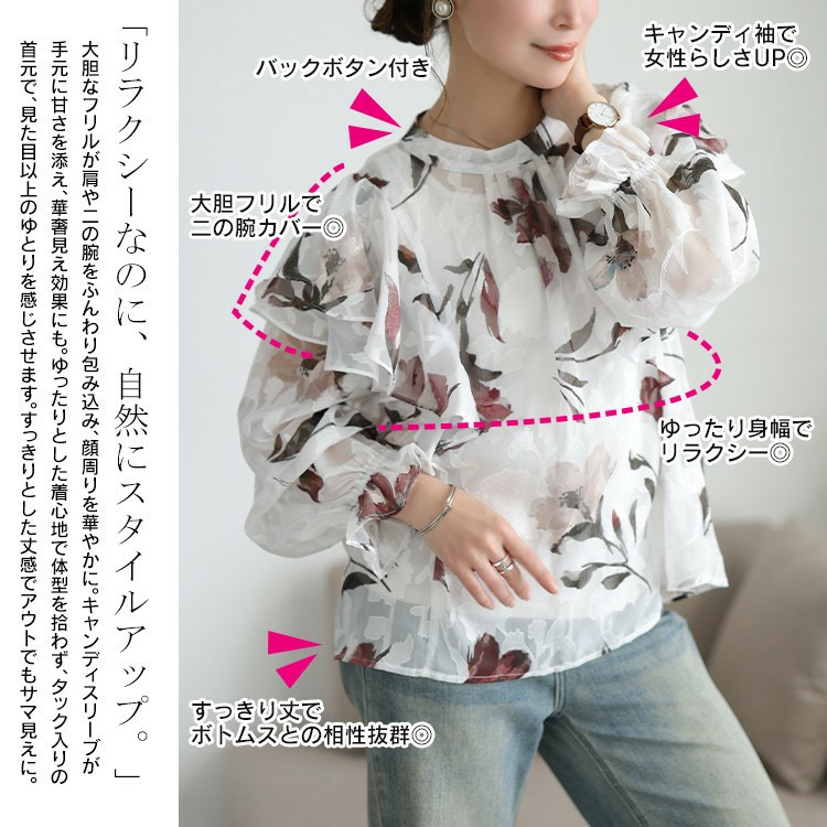 大胆なフリルが肩や二の腕をふんわり包み込み、顔周りを華やかに。キャンディースリーブが手元に甘さを添え、華奢見え効果にも。ゆったりとした着心地で体型を拾わず、タック入りの首元で、見た目以上のゆとりを感じさせます。すっきりとした丈感でアウトでもサマ見えに。