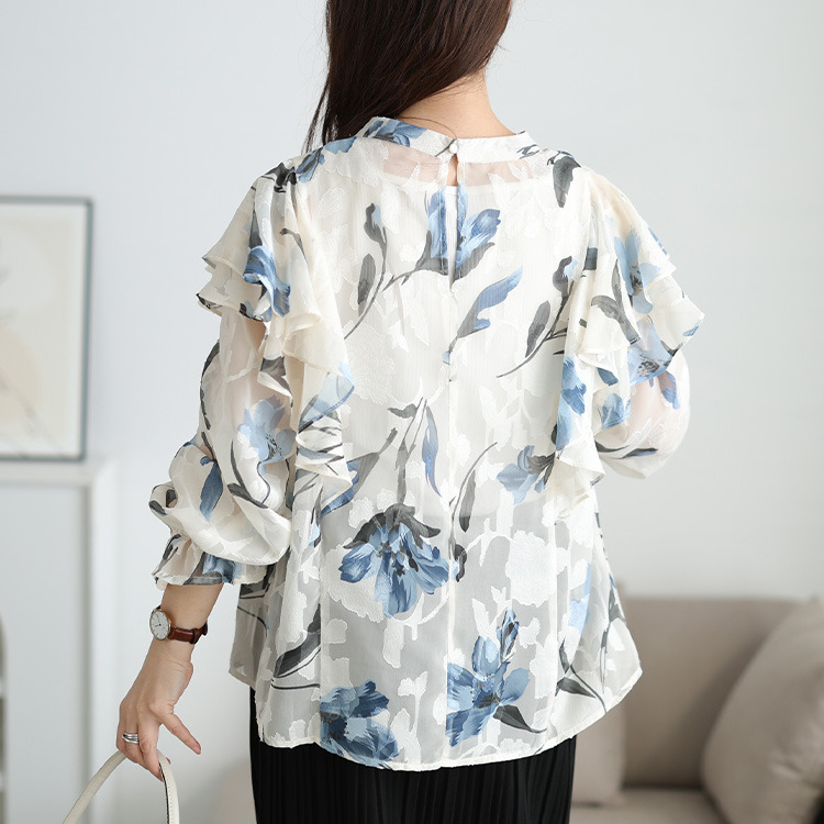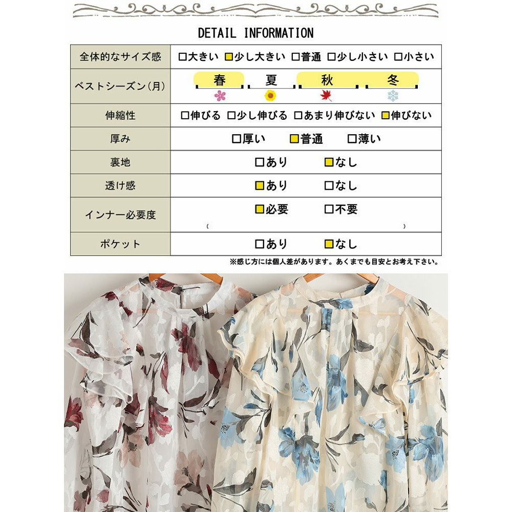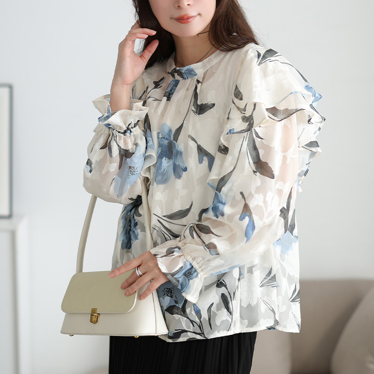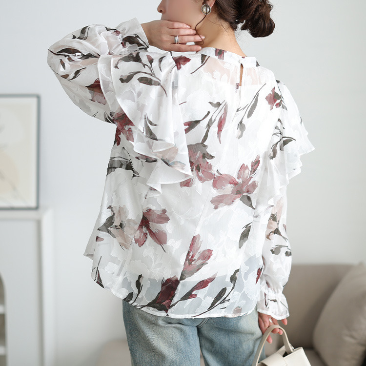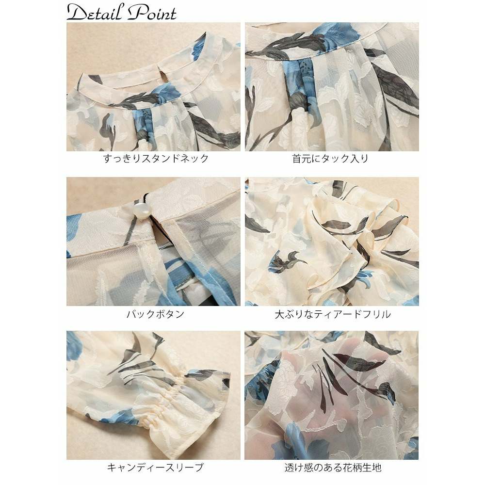 大胆なフリルが肩や二の腕をふんわり包み込み、顔周りを華やかに。キャンディースリーブが手元に甘さを添え、華奢見え効果にも。ゆったりとした着心地で体型を拾わず、タック入りの首元で、見た目以上のゆとりを感じさせます。すっきりとした丈感でアウトでもサマ見えに。