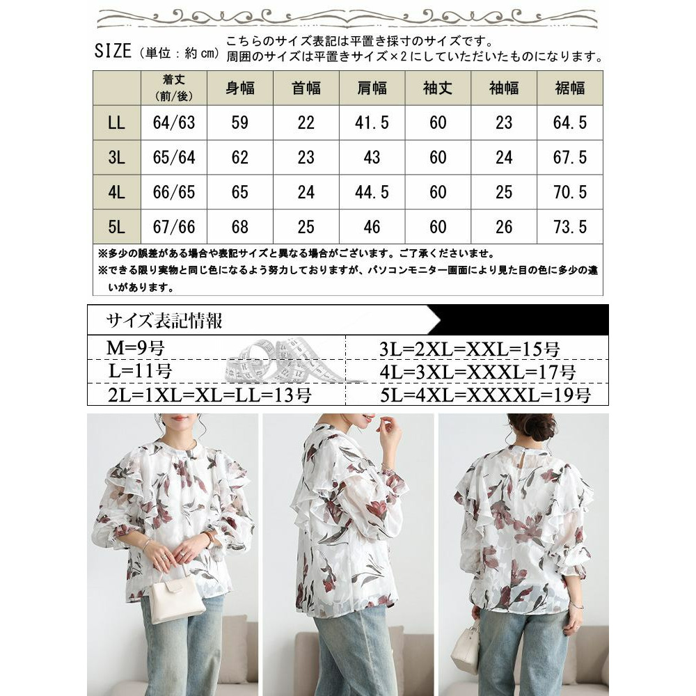 サイズ表記 LL 3L 4L 5L 着丈(前/後) 64/63cm 65/64cm 66/65cm 67/66cm 身幅 59cm 62cm 65cm 68cm 首幅 22cm 23cm 24cm 25cm 肩幅 41.5cm 43cm 44.5cm 46cm 袖丈 60cm 60cm 60cm 60cm 袖幅 23cm 24cm 25cm 26cm 裾幅 64.5cm 67.5cm 73.5cm