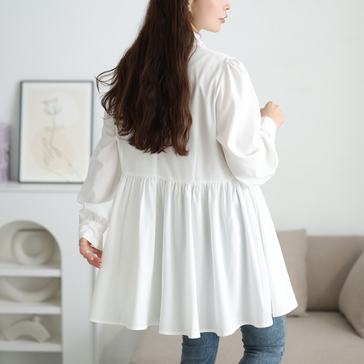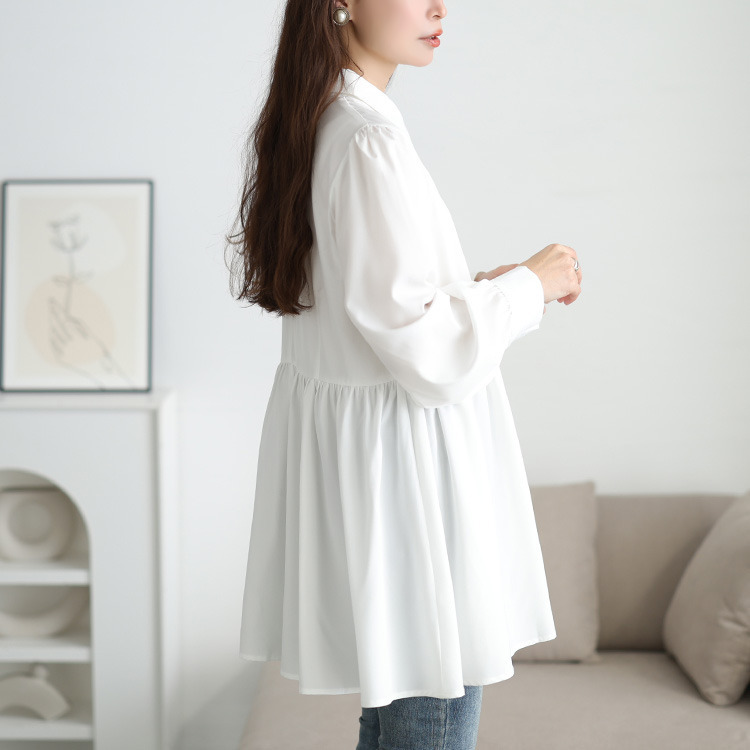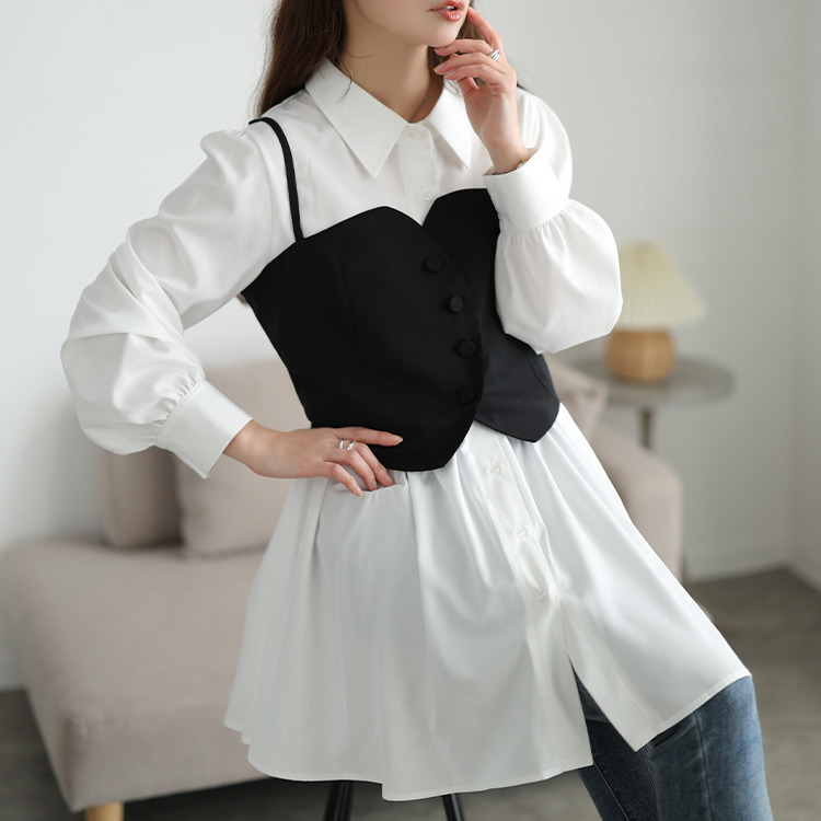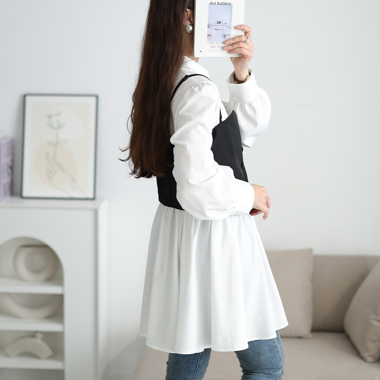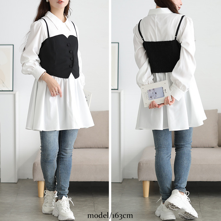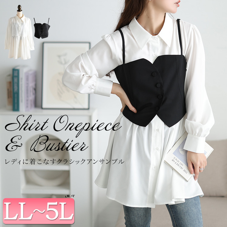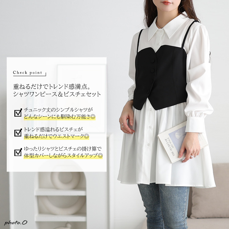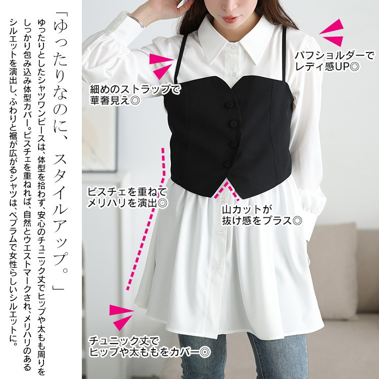 ゆったりとしたシャツワンピースは、体型を拾わず、安心のチュニック丈でヒップや太ももをしっかり包み込み体型カバー。ビスチェを重ねればウエストマークされ、メリハリのあるシルエットを演出し、ふわりと広がるシャツは、ペプラムで女性らしいシルエットに。
