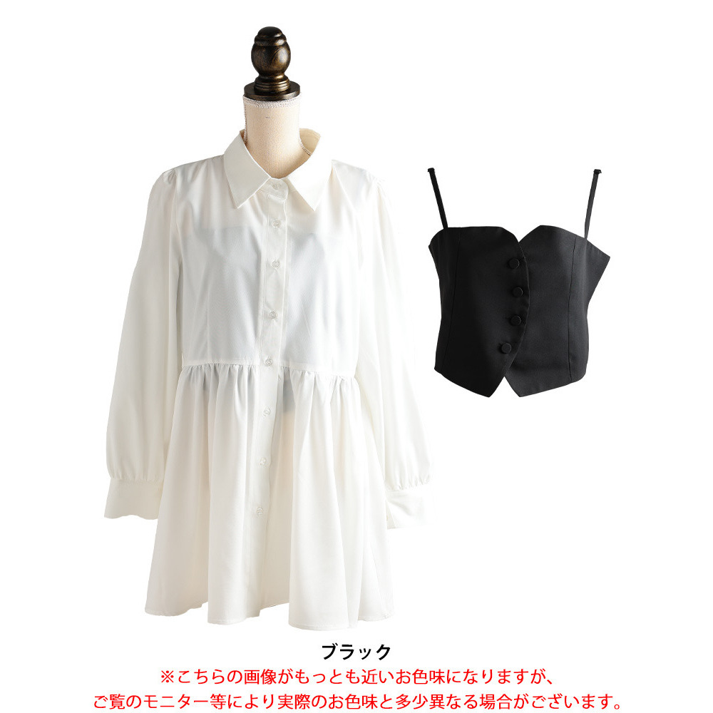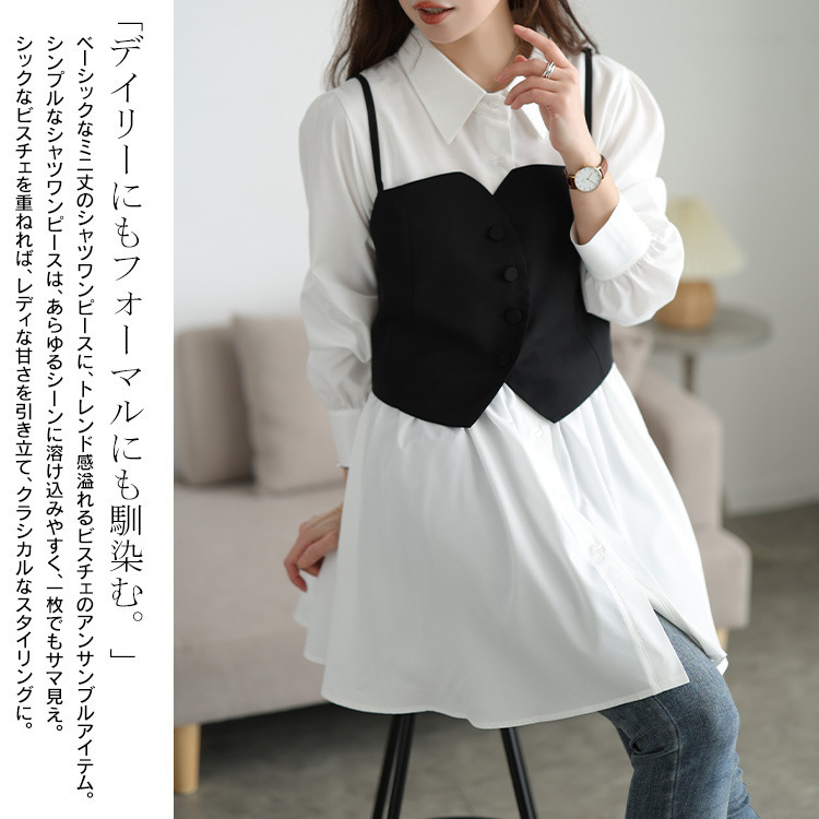 ベーシックなミニ丈のシャツワンピースに、トレンド感溢れるビスチェのアンサンブルアイテム。シンプルなシャツワンピースは、あらゆるシーンに溶け込みやすく、一枚でもサマ見え。シックなビスチェを重ねれば、レディな甘さを引き立て、クラシカルなスタイリングに。