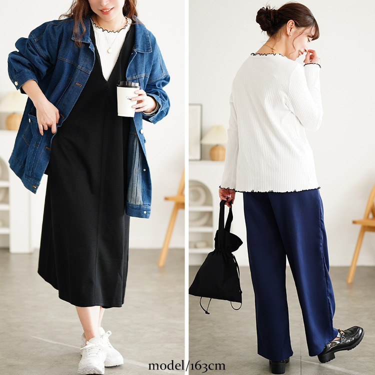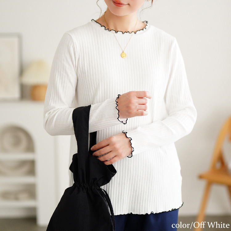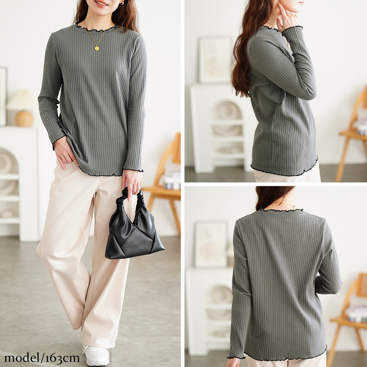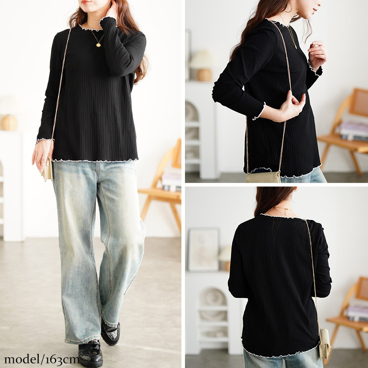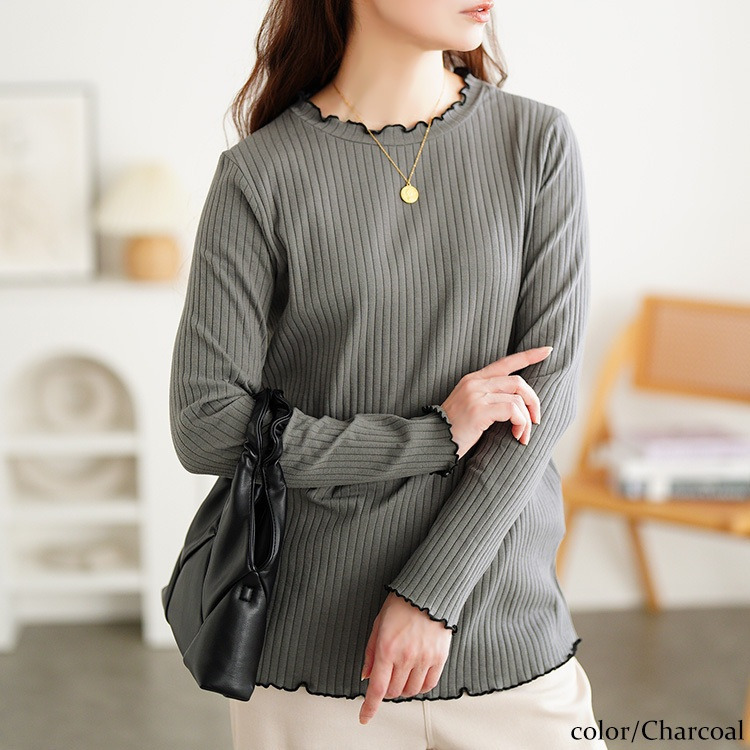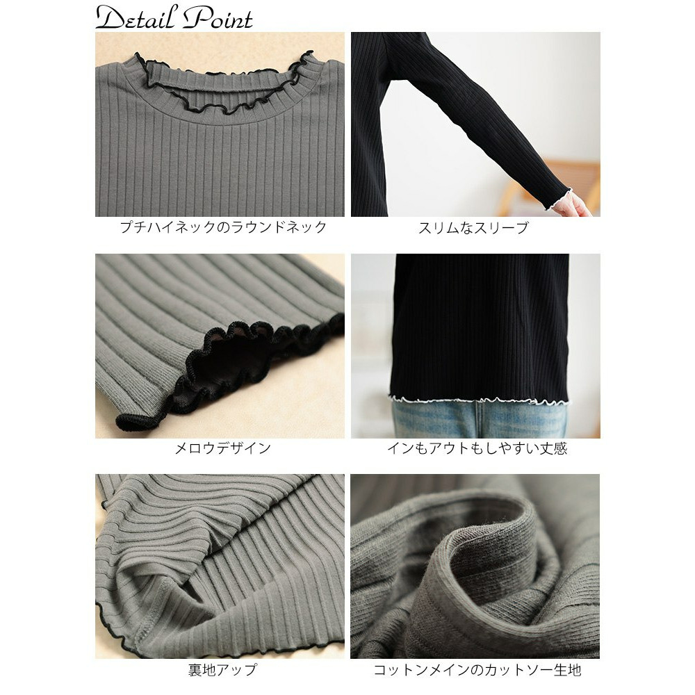 リブ仕立ての生地だから、着るだけで縦ラインを強調し、コンパクトなシルエットと相まってすっきり見えに。首元は2cm丈のプチハイネックでカジュアルながら、きちんと見えをプラス。インもアウトもサマ見えする絶妙丈で、スタイリングの幅も広がります。