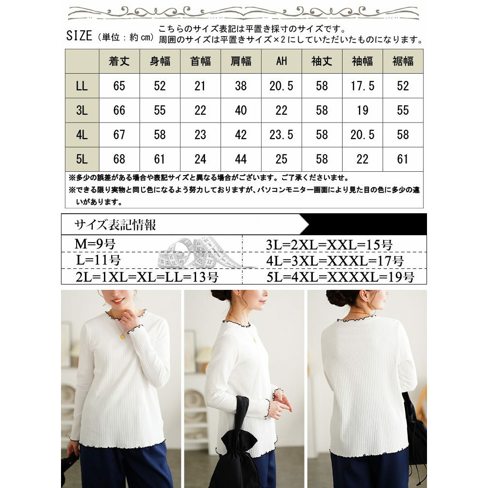 サイズ表記 LL 3L 4L 5L 着丈 65cm 66cm 67cm 68cm 身幅 52cm 55cm 58cm 61cm 首幅 21cm 22cm 23cm 24cm 肩幅 38cm 40cm 42cm 44cm AH 20.5cm 22cm 23.5cm 25cm 袖丈 58cm 58cm 58cm 58cm 袖幅 17.5cm 19cm 20.5cm 22cm 裾幅 52cm 55cm 58cm 61cm