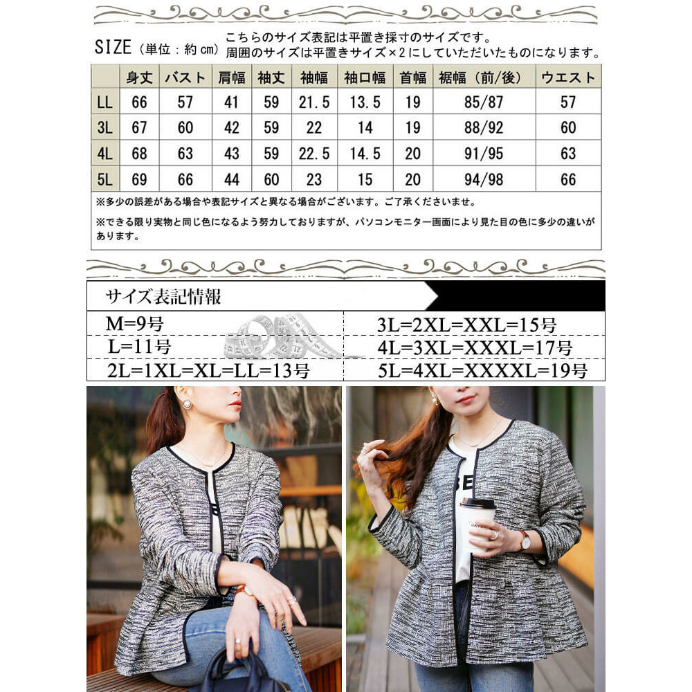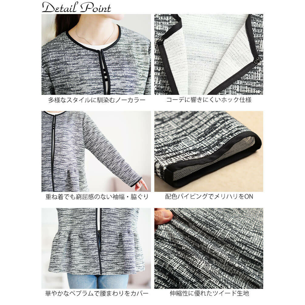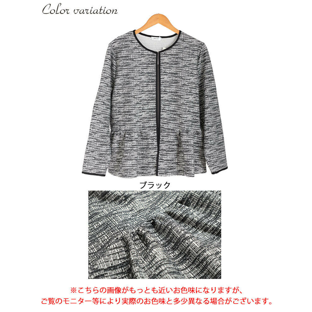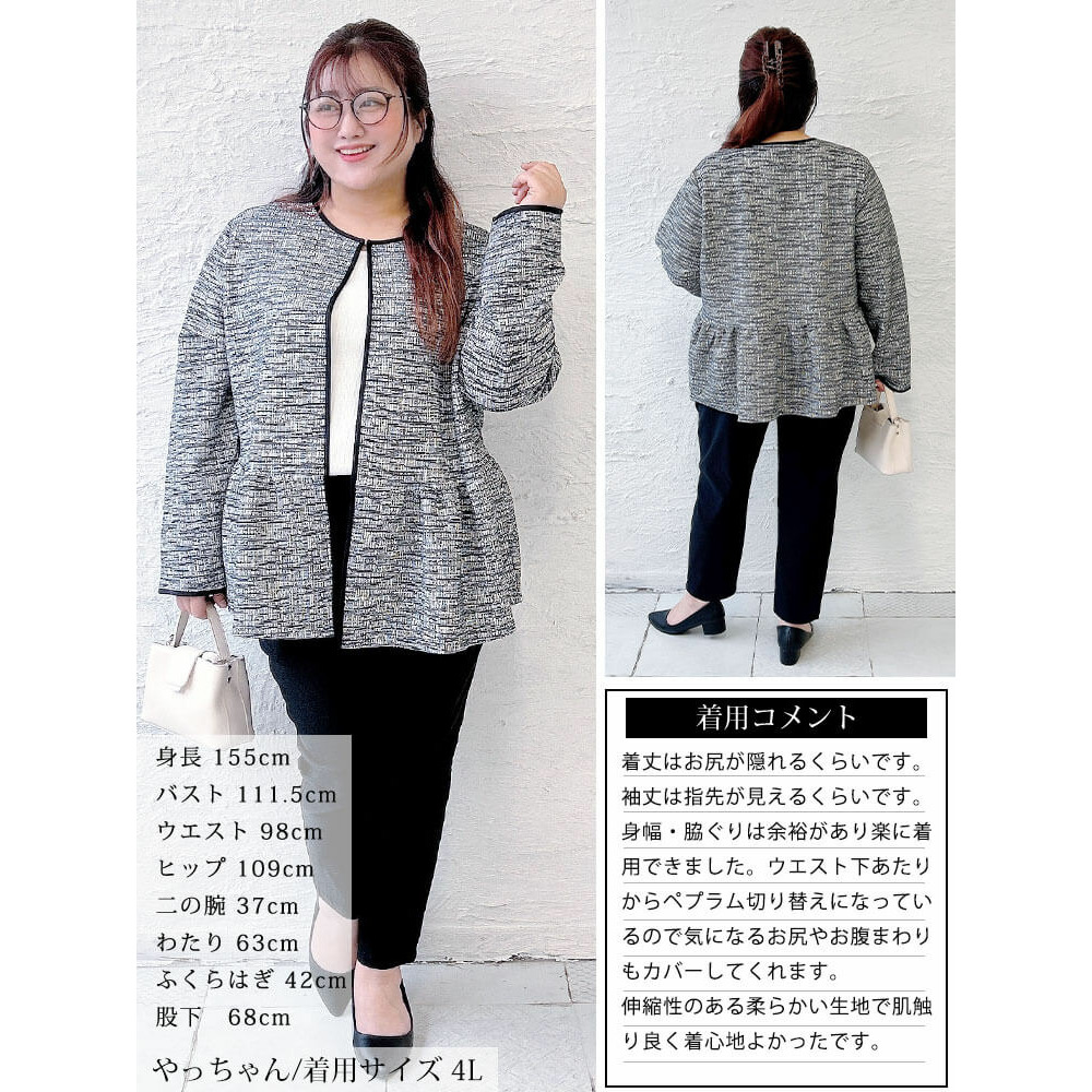 大きいサイズ レディース ラメツイードノーカラーペプラムジャケット