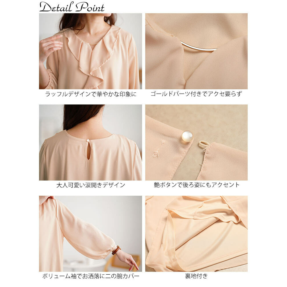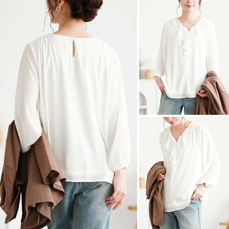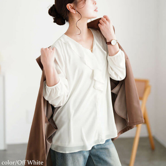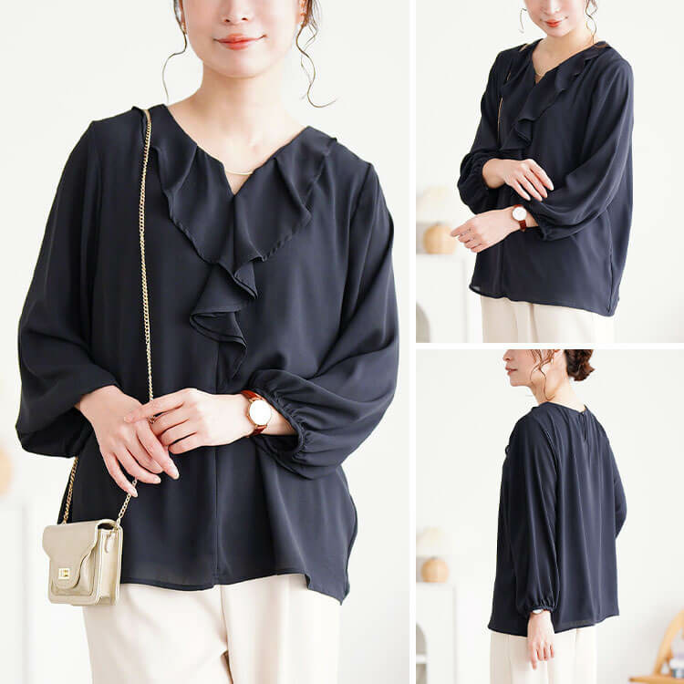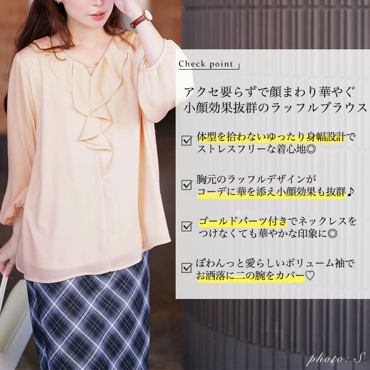 ゴールドパーツ付きラッフルブラウスの登場です。
