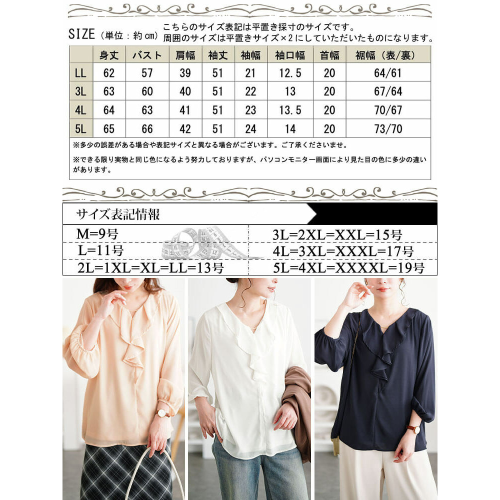 サイズ表記 LL 3L 4L 5L 身丈 62cm 63cm 64cm 65cm バスト 57cm 60cm 63cm 66cm 肩幅 39cm 40cm 41cm 42cm 袖丈 51cm 51cm 51cm 51cm 袖幅 21cm 22cm 23cm 24cm 袖口幅 12.5cm 13cm 13.5cm 14cm 首幅 20cm 20cm 20cm 20cm 裾幅(表/裏) 64/61cm 67/64cm 70/67cm 73/70cm