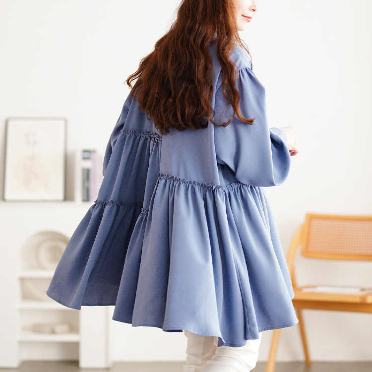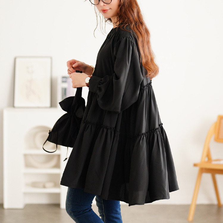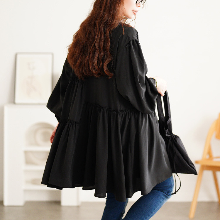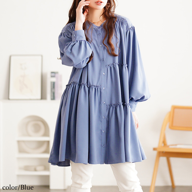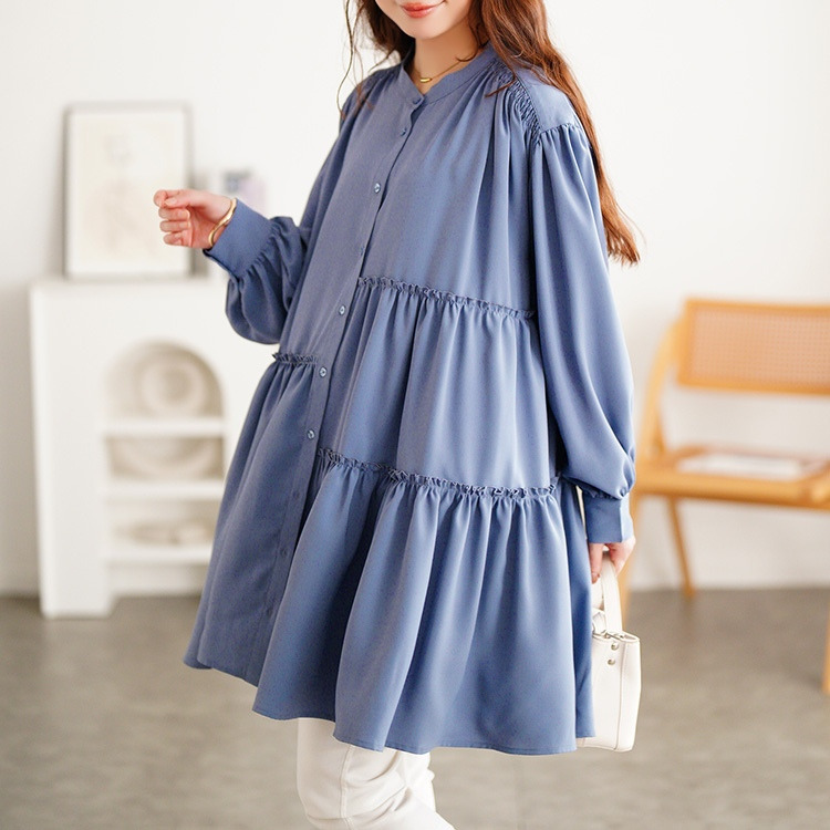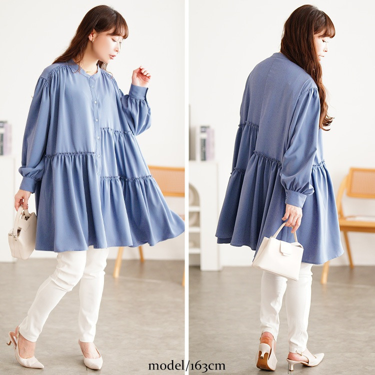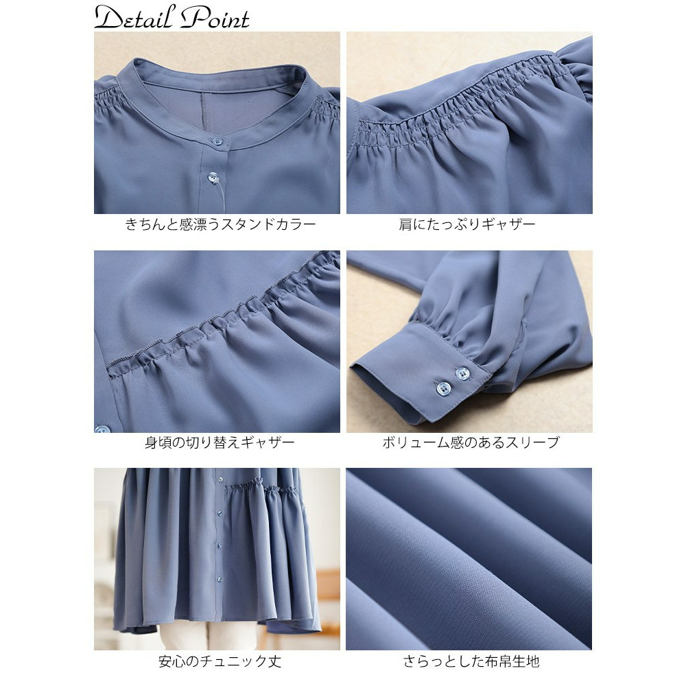 随所にギャザーがあしらわれたデザインで、見た目以上のゆったり感。裾に向かって広がるフレアシルエットと、安心のチュニック丈でお腹周りや、ヒップ、太ももを包み込み、体型を拾わないから着るだけで体型カバー&華奢見えに。ボリューム袖で愛らしく二の腕もカバーしてくれます。