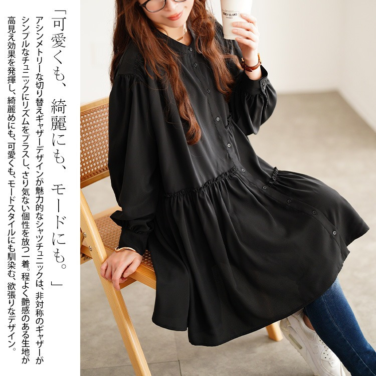 アシンメトリーな切り替えギャザーデザインが魅力的なシャツチュニックは、非対称のギャザーがシンプルなチュニックにリズムをプラスし、さり気ない個性を放つ一着。程よく艶感のある生地が高見え効果を発揮し、綺麗めにも、可愛くも、モードスタイルにも馴染む、欲張りなデザイン。