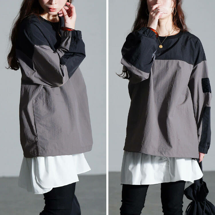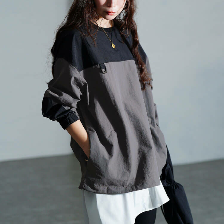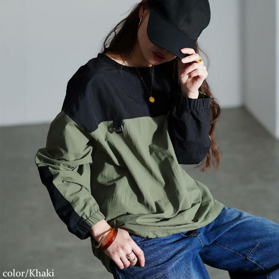 洒落感高まるアシメ袖切り替えや、胸元カラビナがカジュアルな雰囲気の中にモード感を漂わせる唯一無二の一着です!