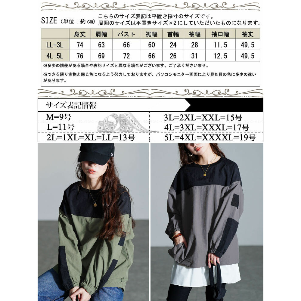 サイズ表記 LL-3L 4L-5L 身丈 74cm 76cm 肩幅 63cm 69cm バスト 66cm 72cm 裾幅 60cm 66cm 首幅 24cm 26cm 袖幅 28cm 31cm 袖口幅 11.5cm 12.5cm 袖丈 49.5cm 49.5cm