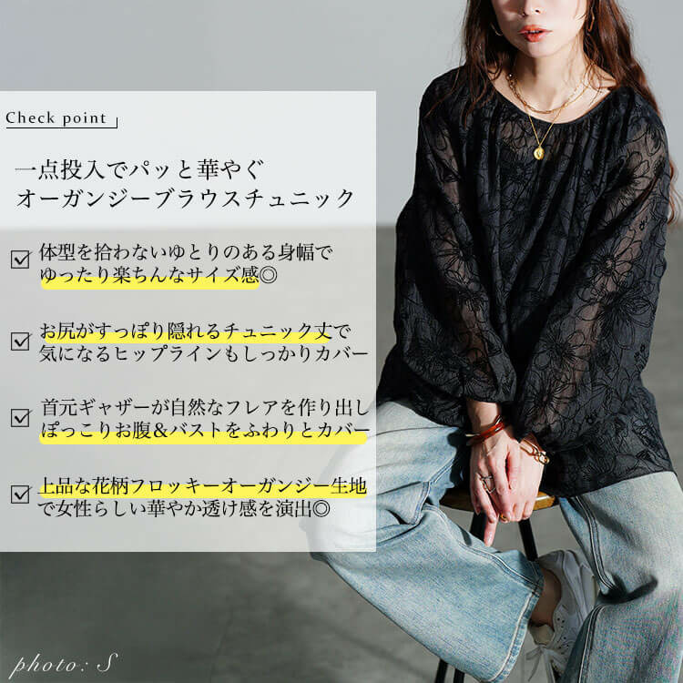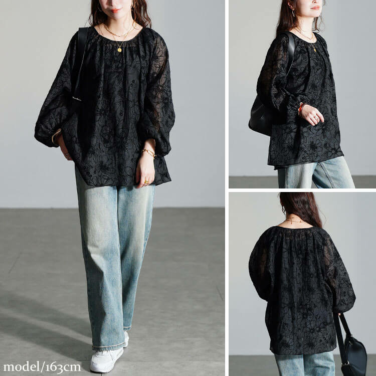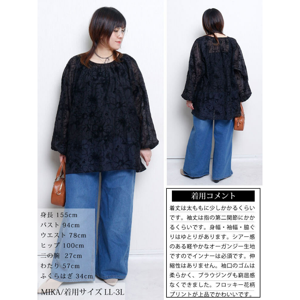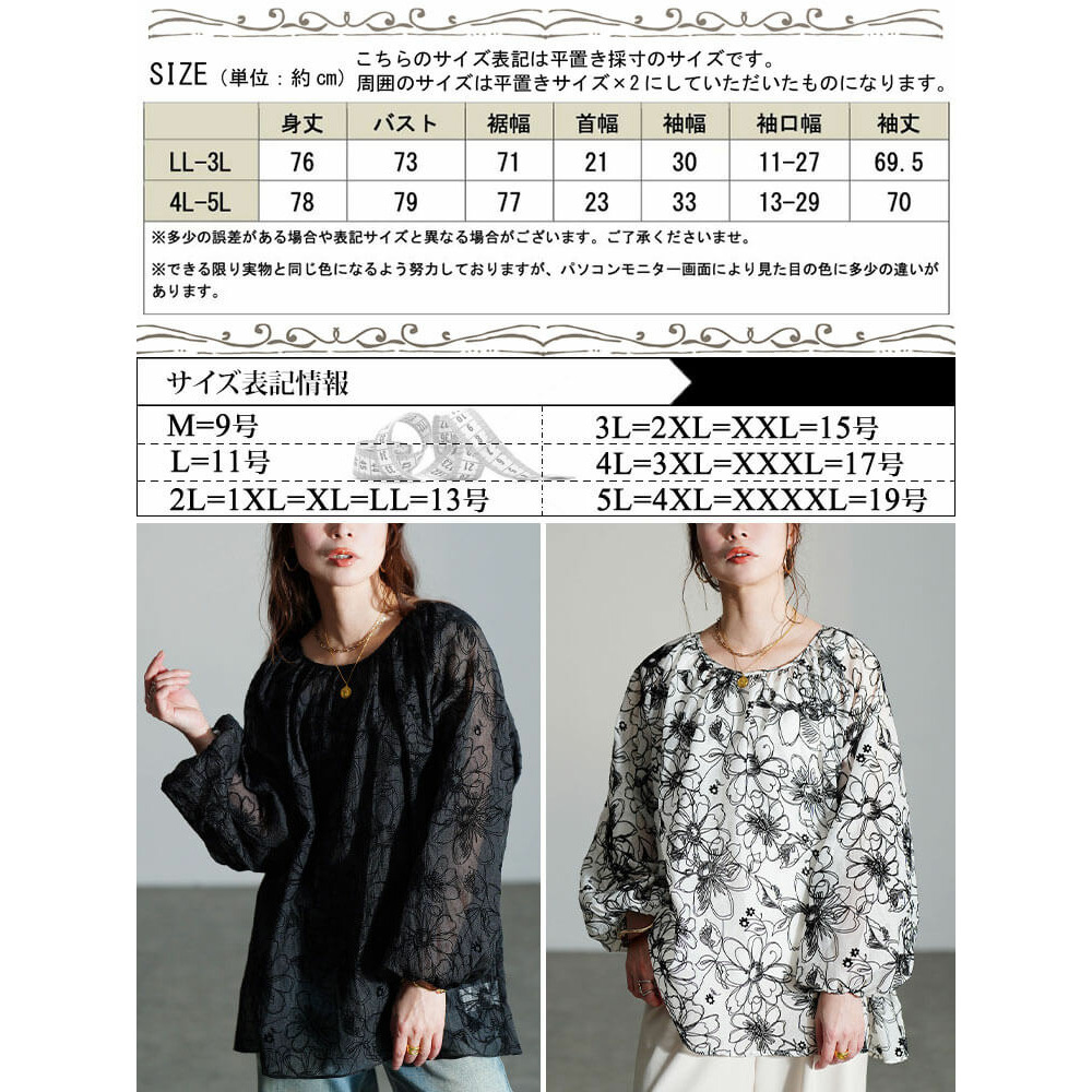 • 大きいサイズ レディース フロッキー花柄オーガンジーギャザーブラウス11