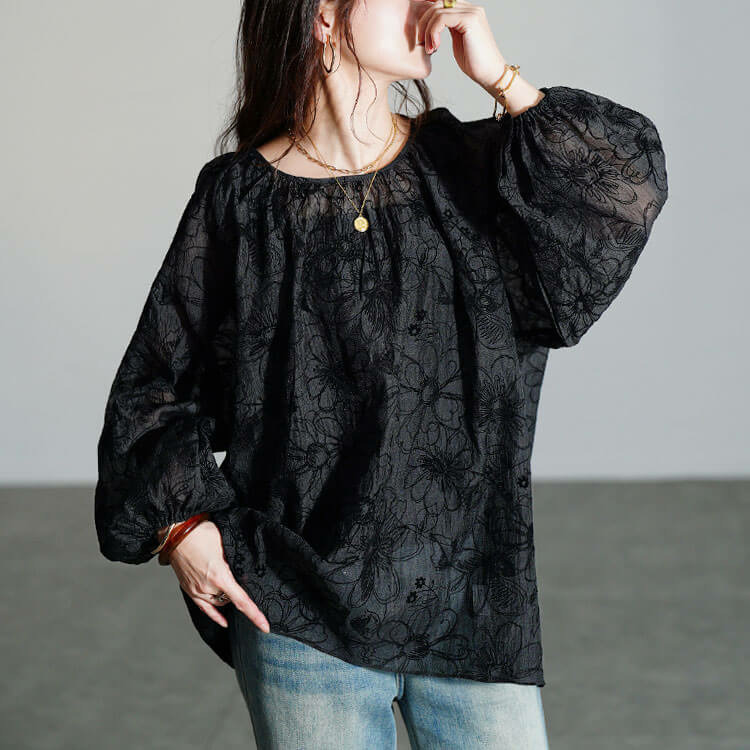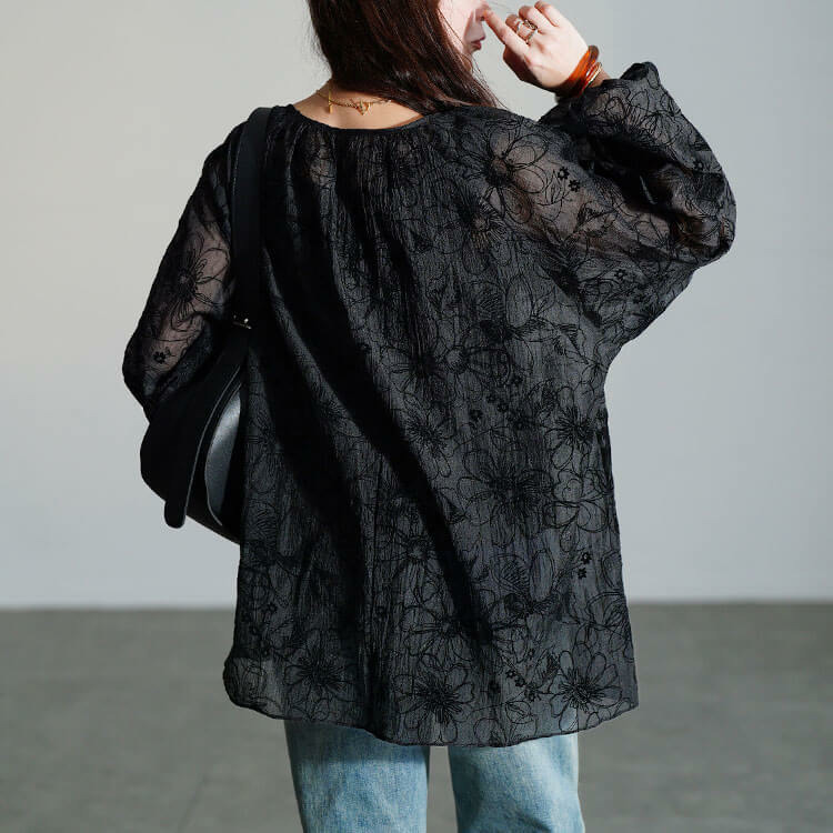 • 大きいサイズ レディース フロッキー花柄オーガンジーギャザーブラウス1