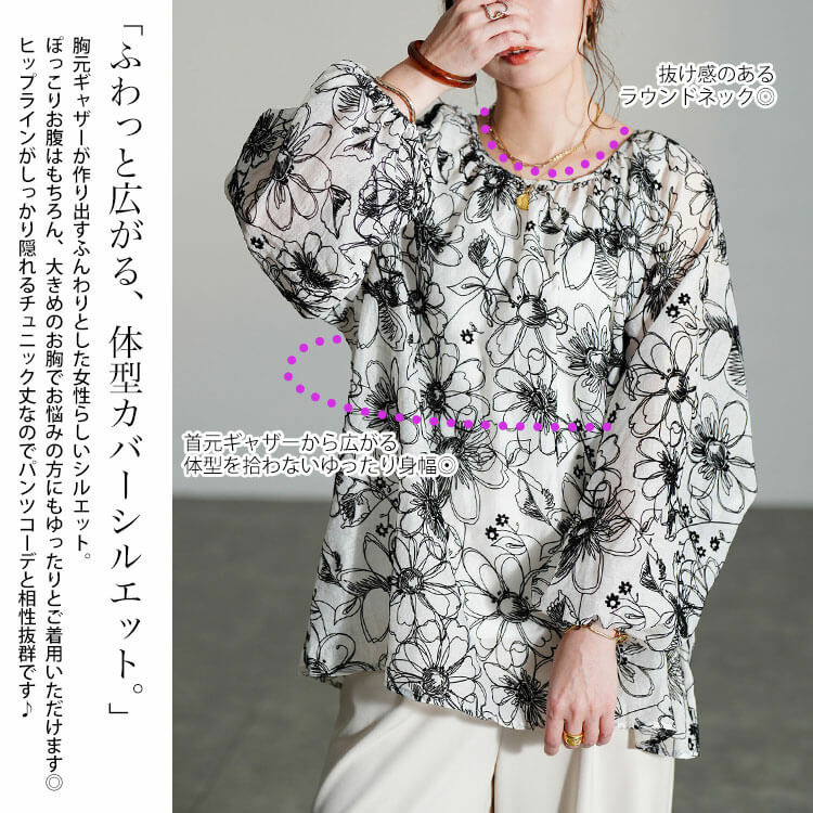 首元ギャザーが作り出す体型を拾わないふんわりシルエットで窮屈感のないリラクシーな着心地です。