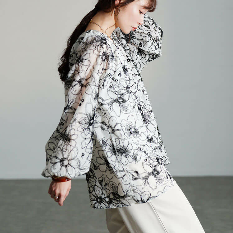フロッキー花柄オーガンジーギャザーブラウスの登場です!