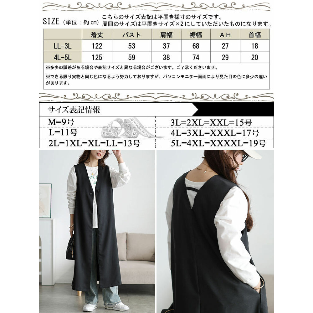サイズ表記 LL-3L 4L-5L 着丈 122cm 125cm バスト 53cm 59cm 肩幅 37cm 38cm 裾幅 68cm 74cm アームホール 27cm 29cm 首幅 18cm 20cm