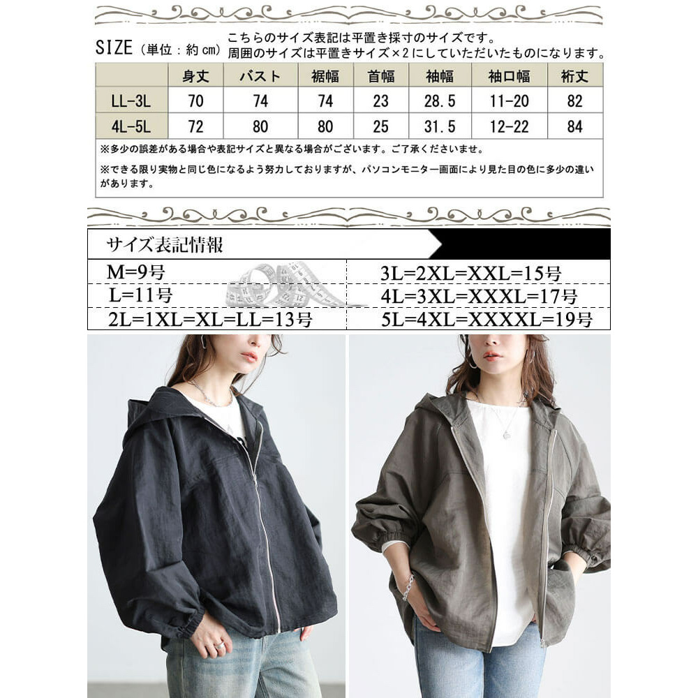 サイズ表記 LL-3L 4L-5L 身丈 70cm 72cm バスト 74cm 80cm 裾幅 74cm 80cm 首幅 23cm 25cm 袖幅 28.5cm 31.5cm 袖口幅 11-20cm 12-22cm 裄丈 82cm 84cm