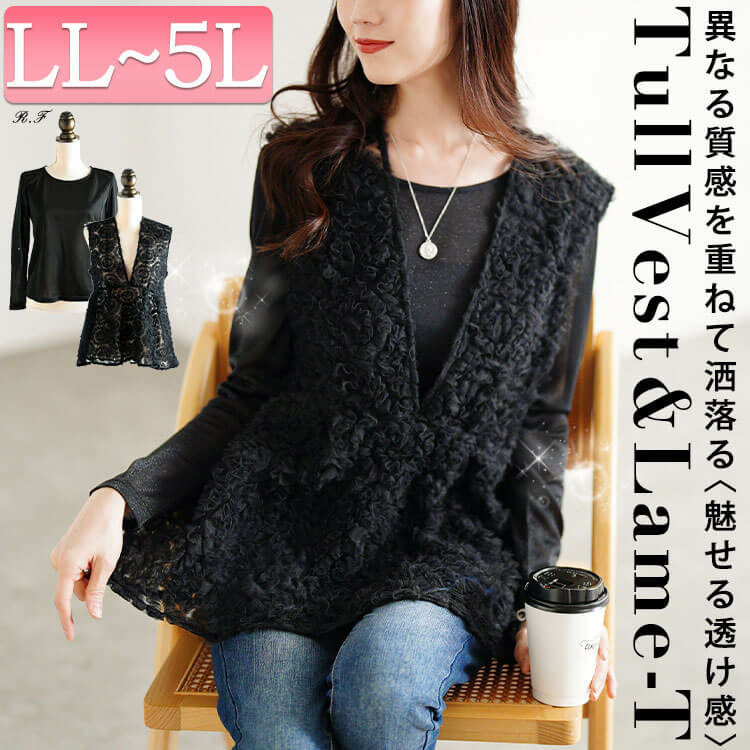 • 大きいサイズ レディース チュール刺繍ペプラムベスト&シアーラメロンT2点セット19