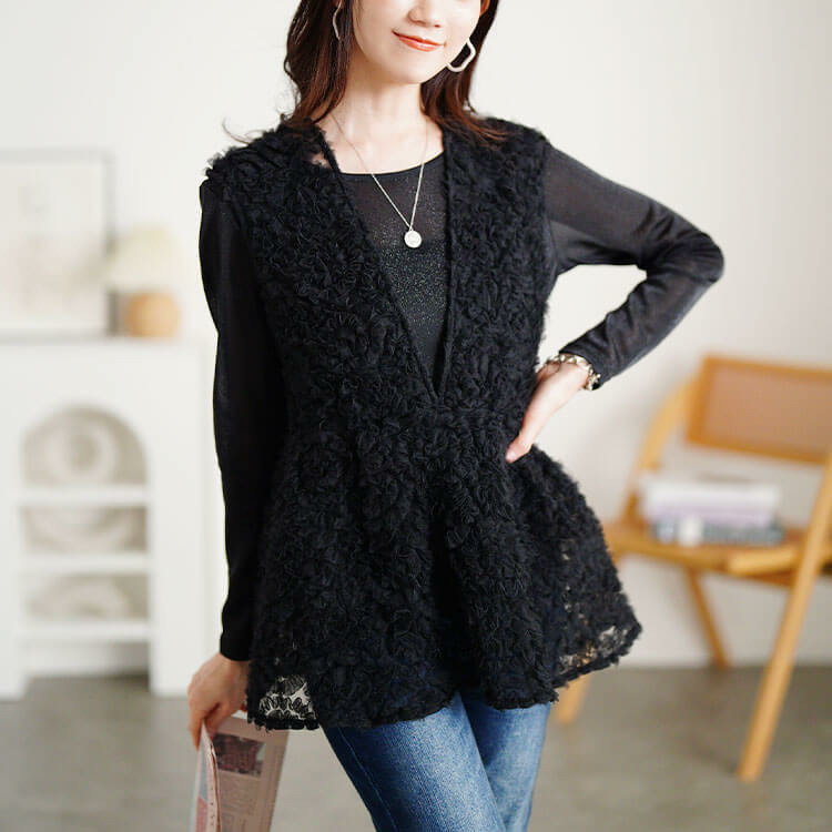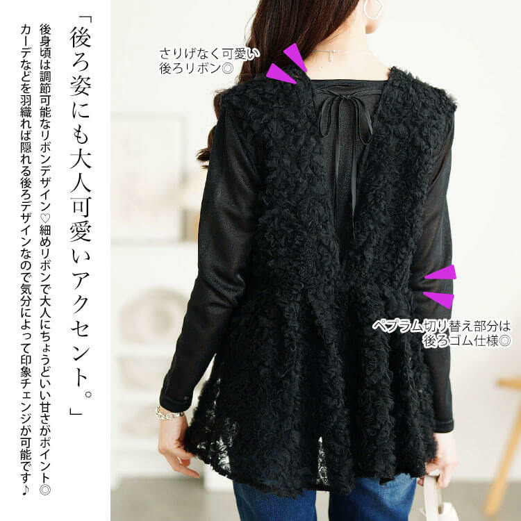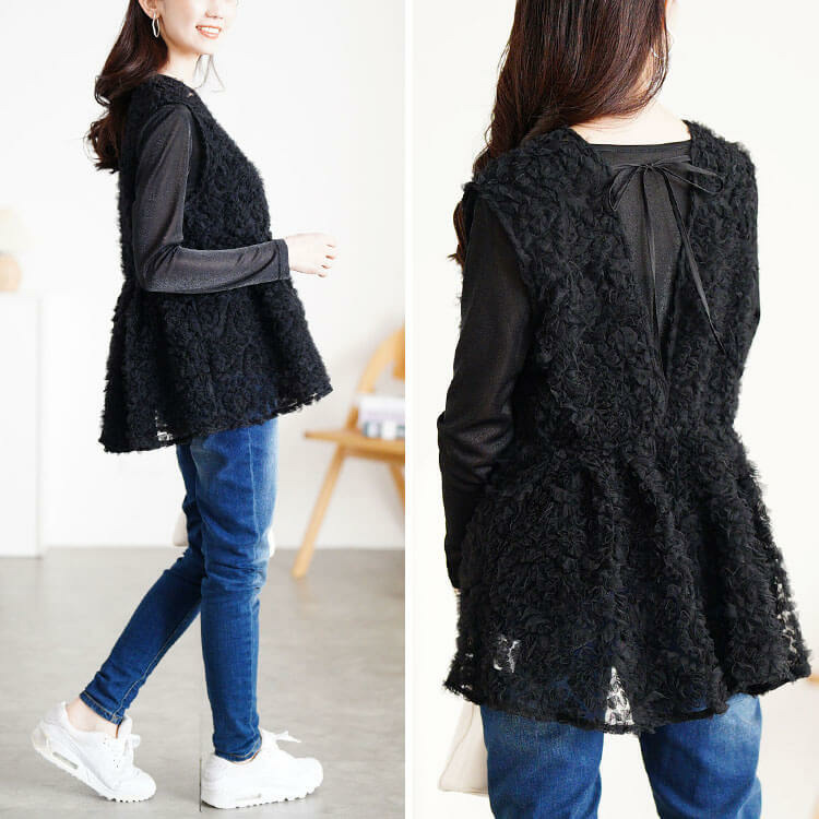 ふわふわのチュール刺繍が可愛いペプラムベストはハイウエスト設計で脚長見え☆