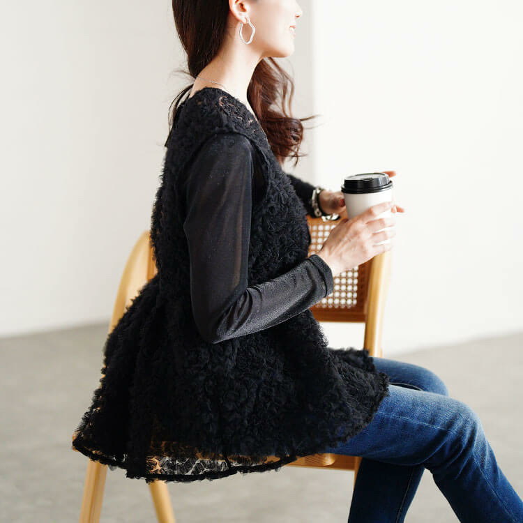 透け感を重ねて洒落る、チュール刺繍ペプラムベスト&シアーラメロンT2点セット。