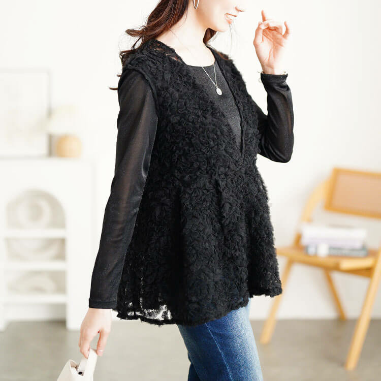 • 大きいサイズ レディース チュール刺繍ペプラムベスト&シアーラメロンT2点セット3