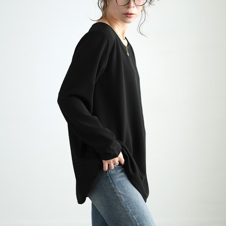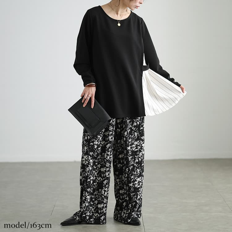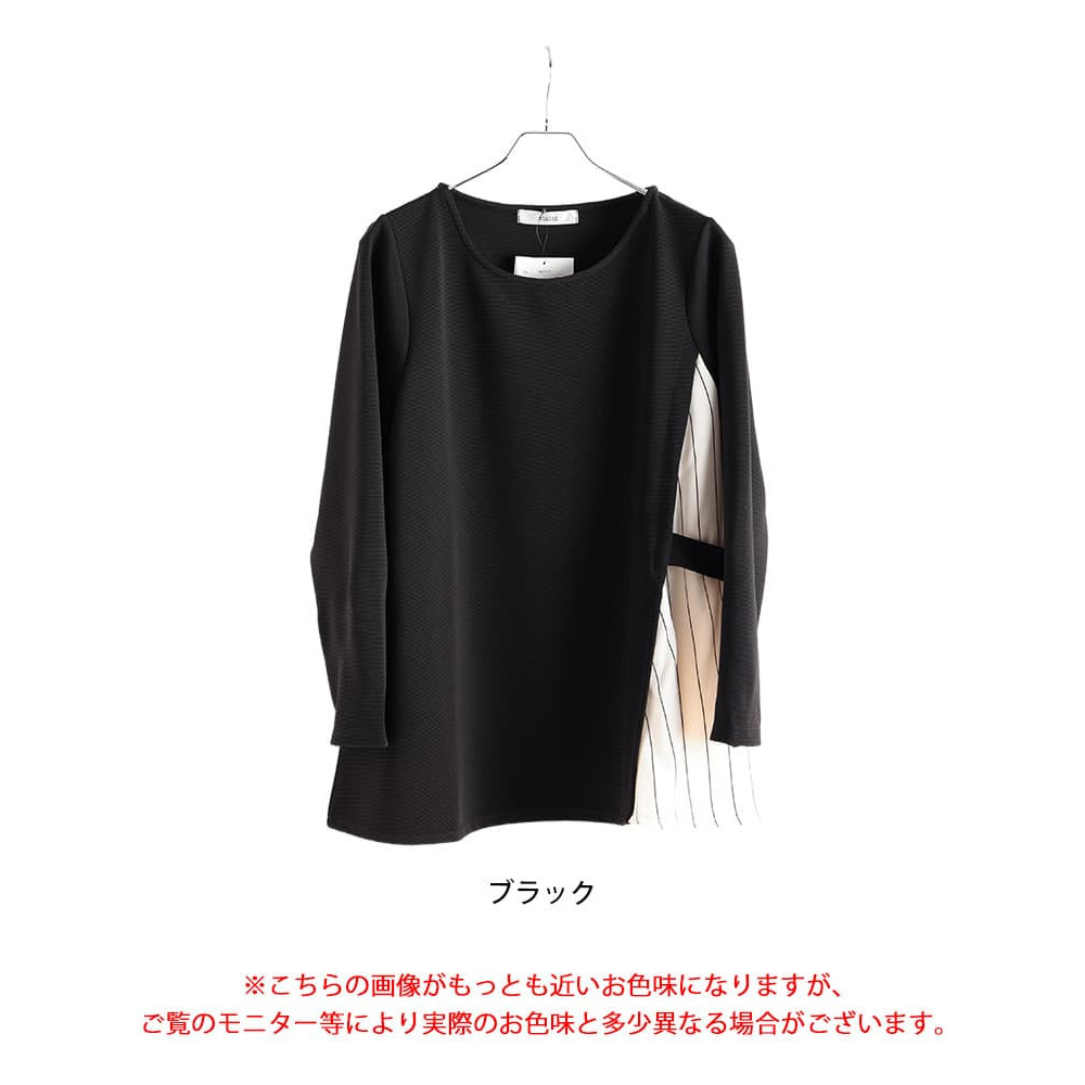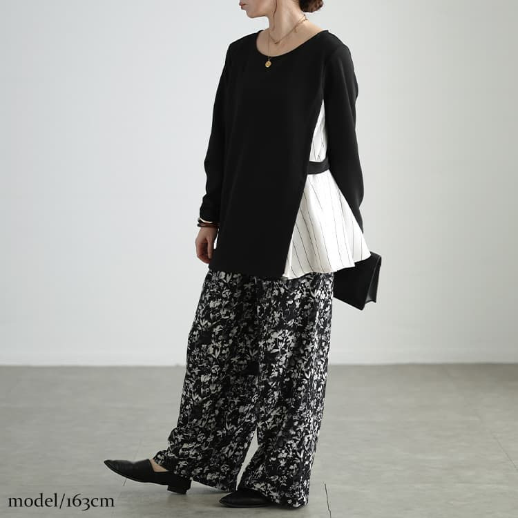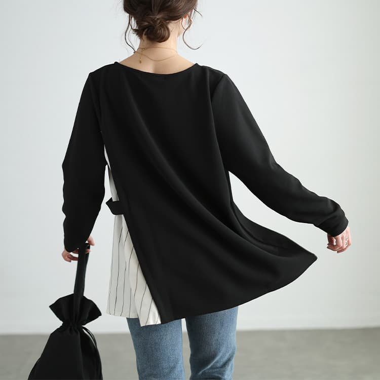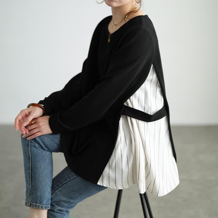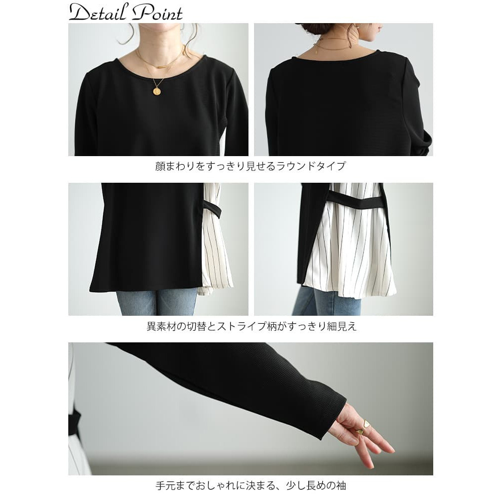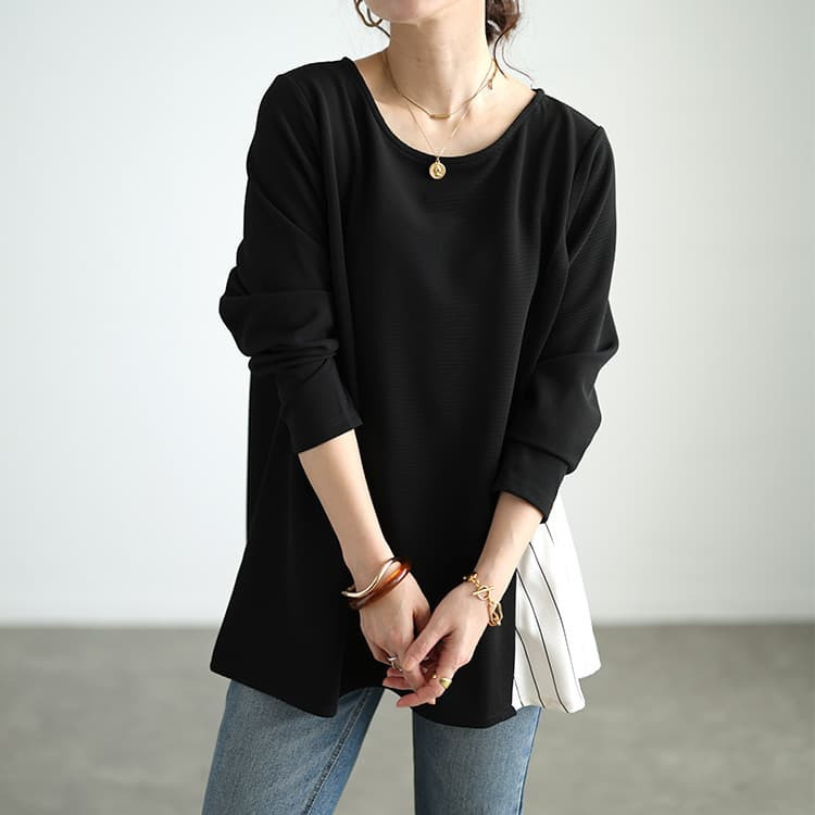さらりと伸びのあるカットソー生地に、サイドは落ち感のきれいなストライプ素材を切り替えた、フェイクレイヤードデザイン。