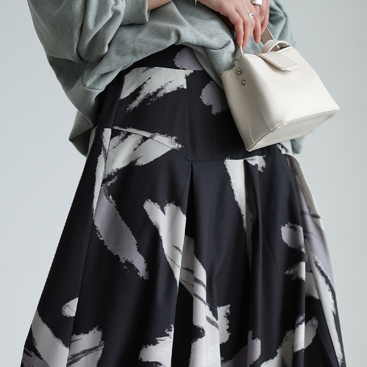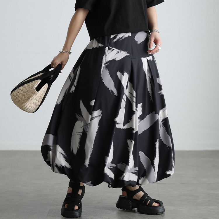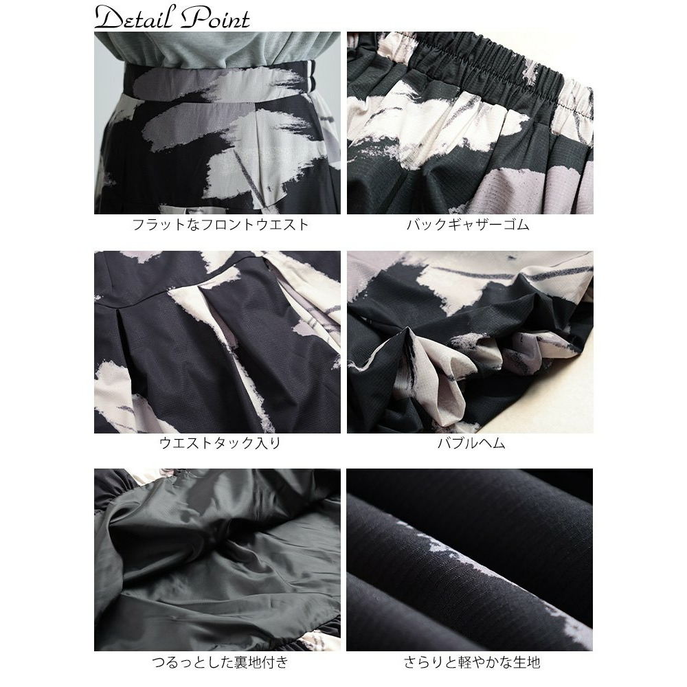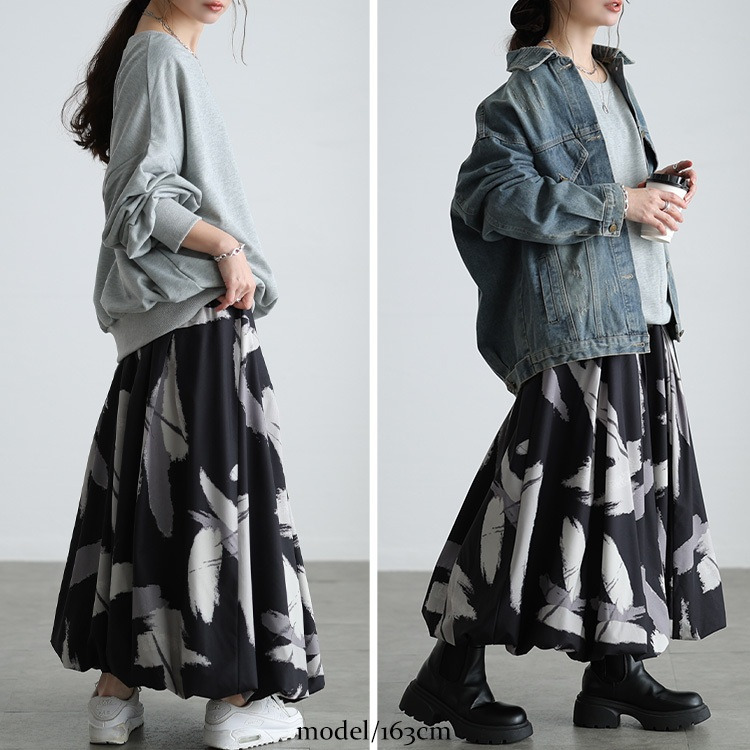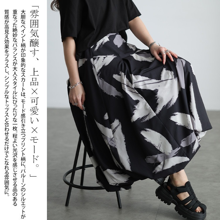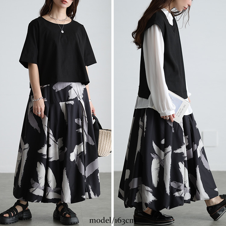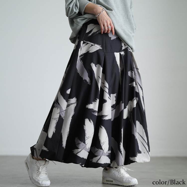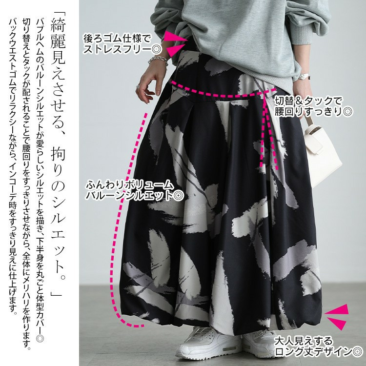 バブルヘムのバルーンシルエットが愛らしいシルエットを描き、下半身を丸ごと体型カバー。切り替えとタックが配されることで腰回りをすっきりさせながら、全体にメリハリを作ります。バックウエストゴムでリラクシーながら、インコーデ時をすっきり見えに仕上げます。