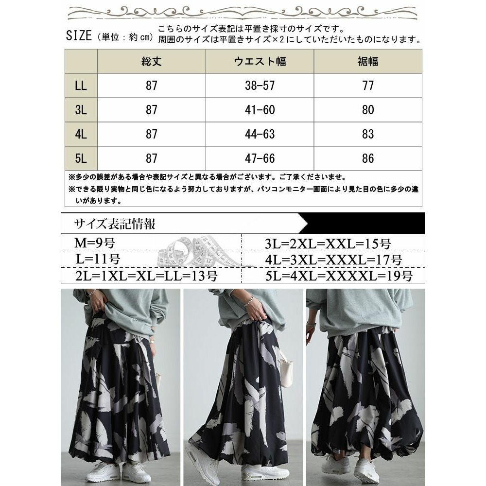 サイズ表記 LL 3L 4L 5L 総丈 87cm 87cm 87cm 87cm ウエスト幅 38-57cm 41-60cm 44-63cm 47-66cm 裾幅 77cm 80cm 83cm 86cm