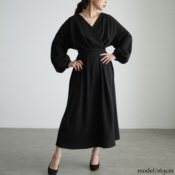 広めのVネックでデコルテラインを美しく魅せつつ、すっきり見えに。カシュクール部分にはスナップボタン付きで開き具合を調節可能。ウエストのタックが全体をメリハリあるシルエットにし、後ろゴムで窮屈感を感じさせません。ふんわりボリューム袖で二の腕も愛らしくカバー◎