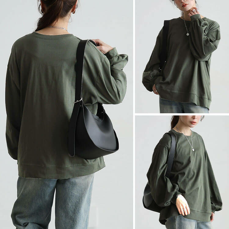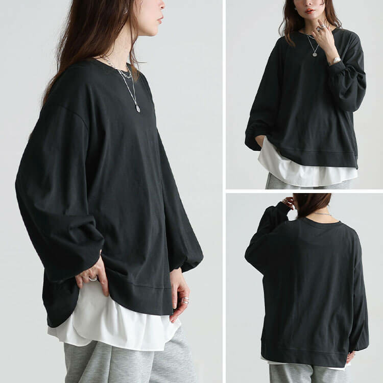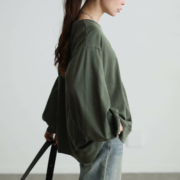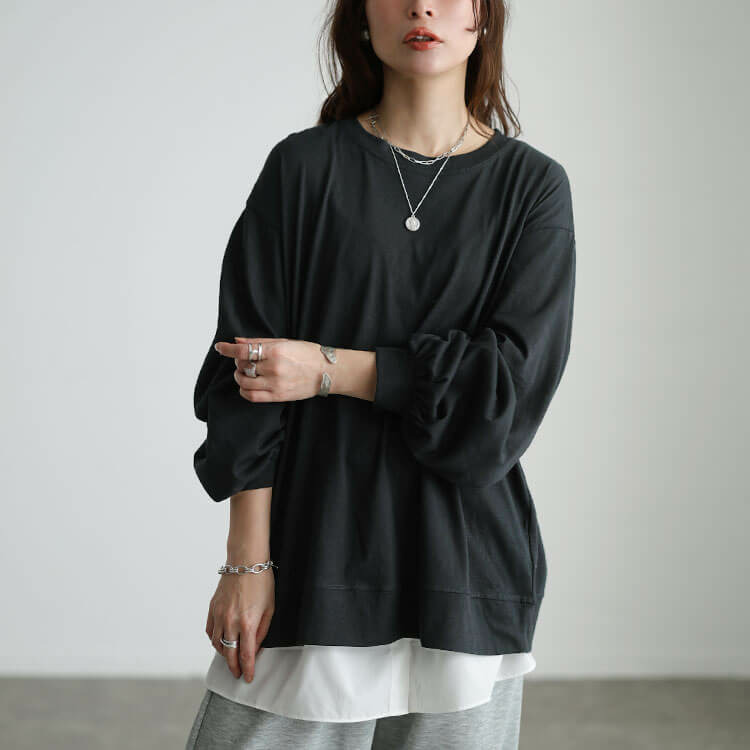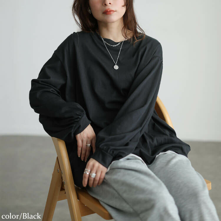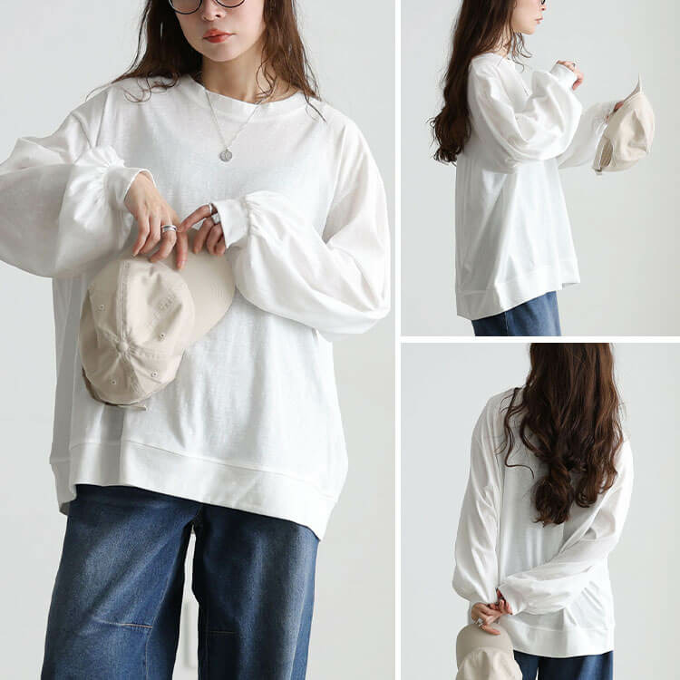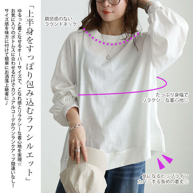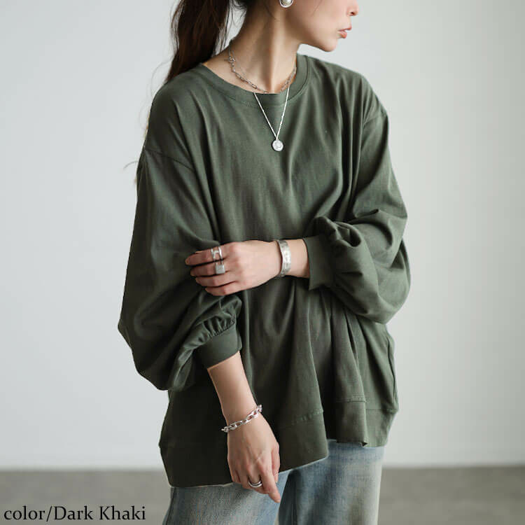 ドロップショルダーとルーズぼわん袖がこなれ感を演出し自然に二の腕をカバー♪