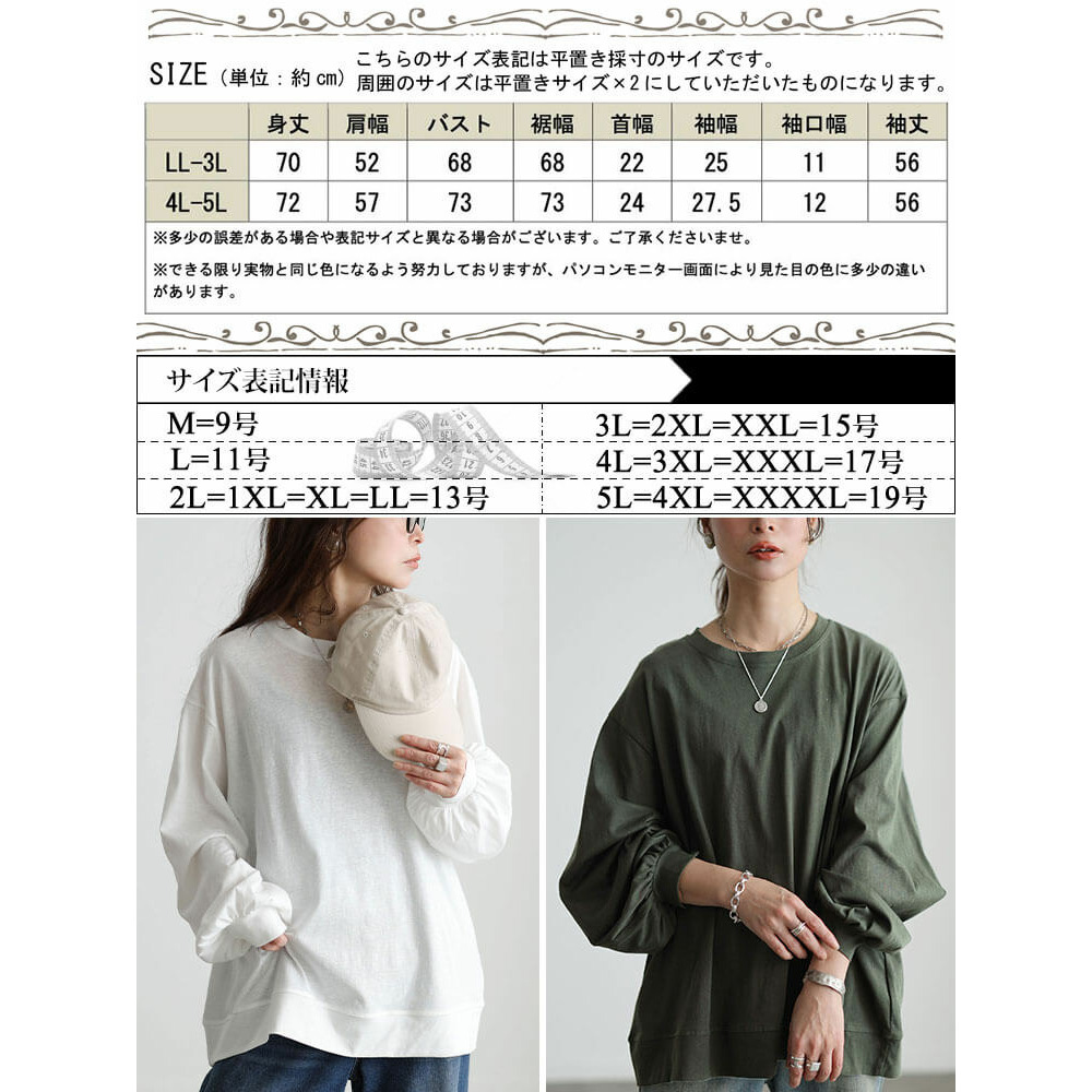 サイズ表記 LL-3L 4L-5L 身丈 70cm 72cm 肩幅 52cm 57cm バスト 68cm 73cm 裾幅 68cm 73cm 首幅 22cm 24cm 袖幅 25cm 27.5cm 袖口幅 11cm 12cm 袖丈 56cm 56cm