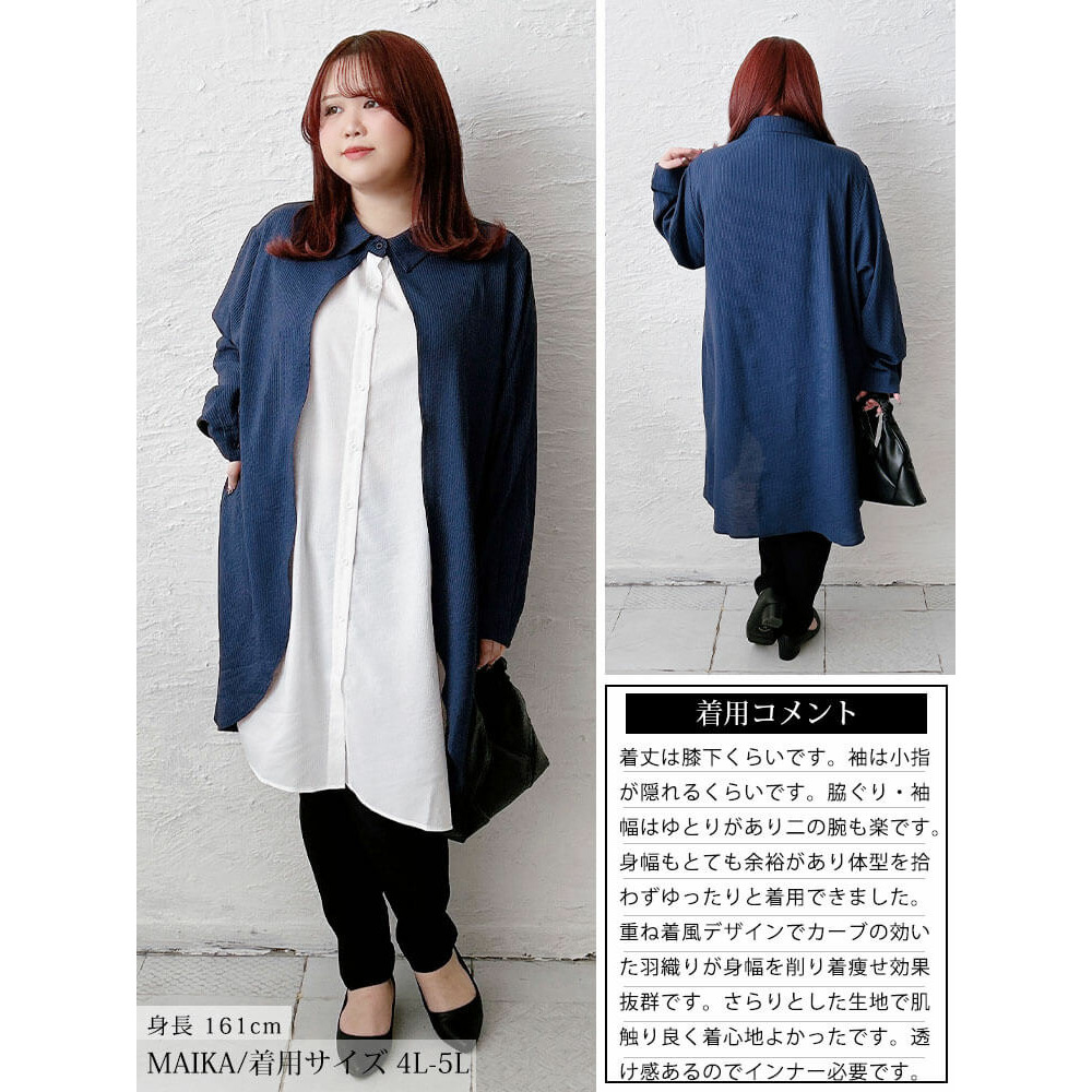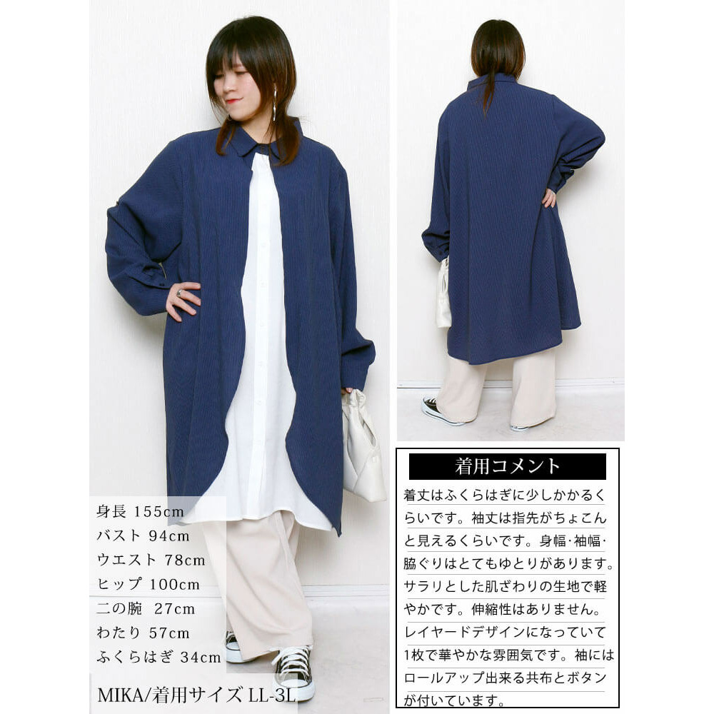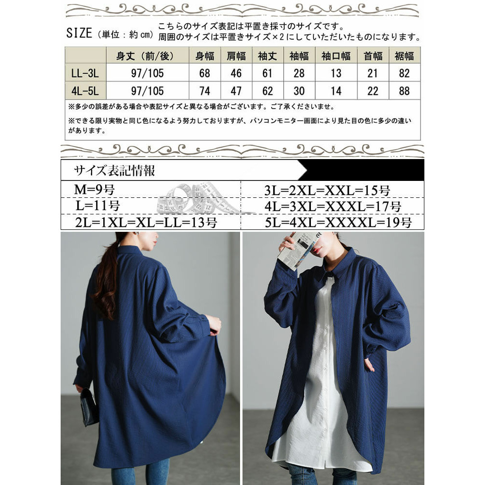 サイズ表記 LL-3L 4L-5L 総丈 81cm 86cm 肩幅 69cm 71cm 脇下幅 84cm 90cm 天巾 33cm 35cm アームホール 28cm 30cm 袖丈 46cm 47cm 袖口幅 17.5cm 18.5cm 裾幅 83cm 89cm