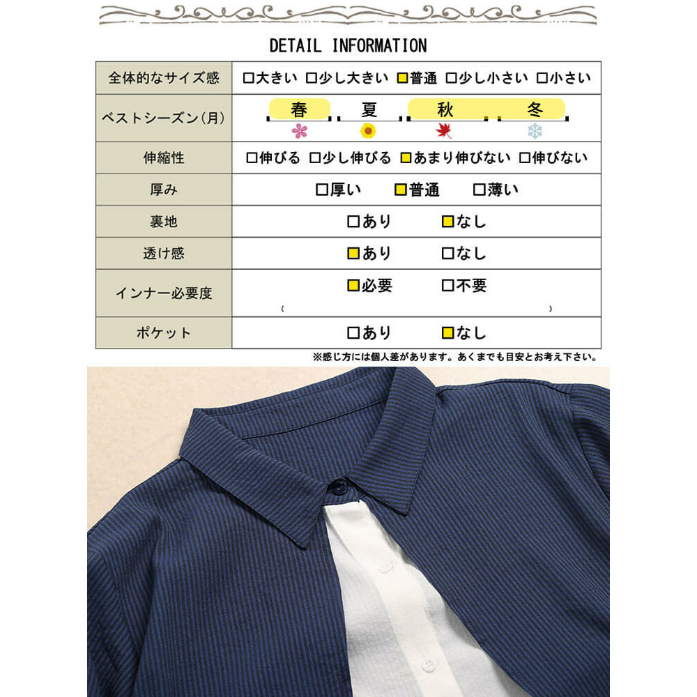 | 素材 | ポリエステル 65% レーヨン 26% ポリウレタン 9% |