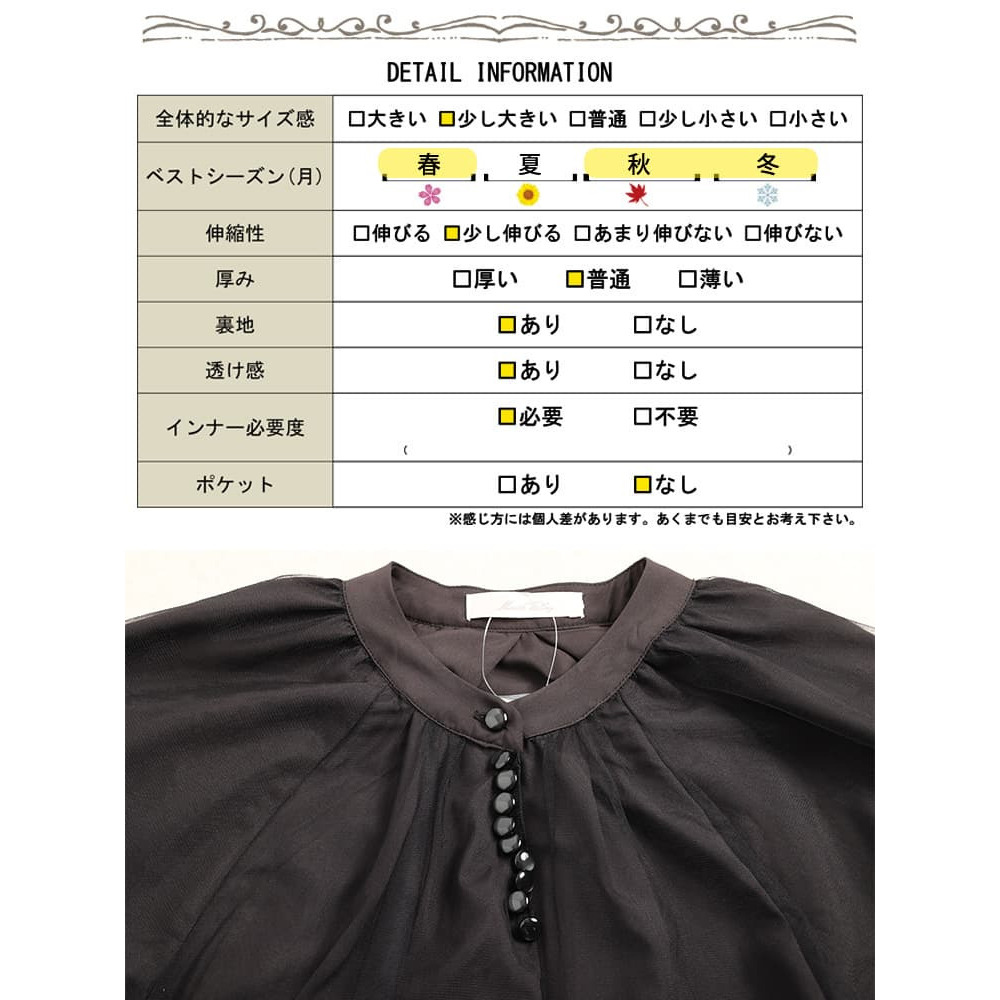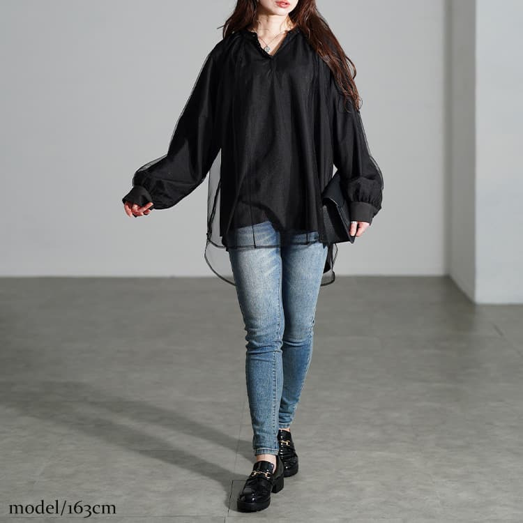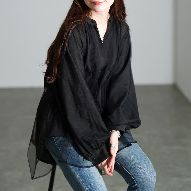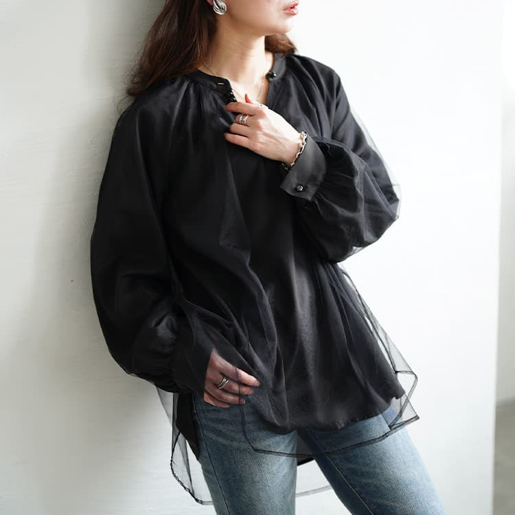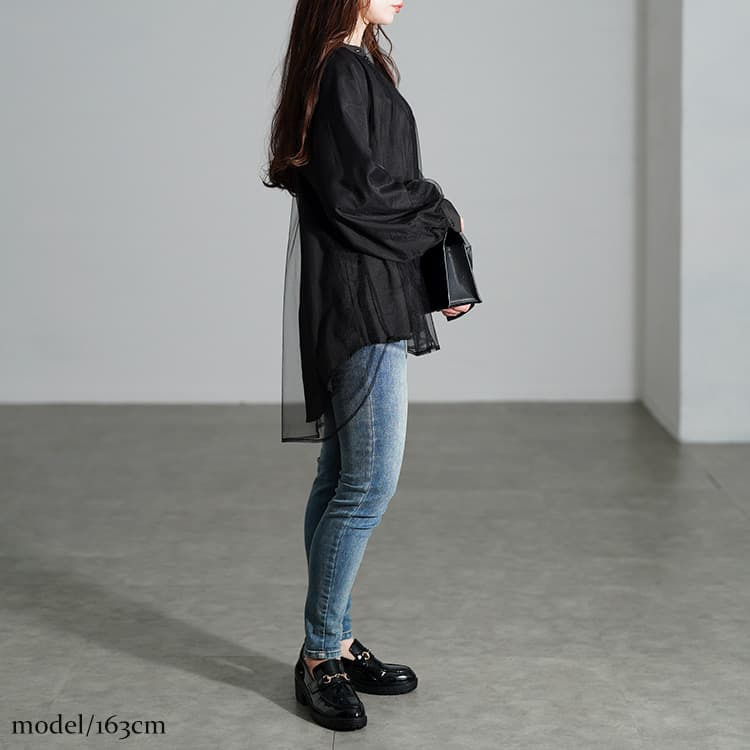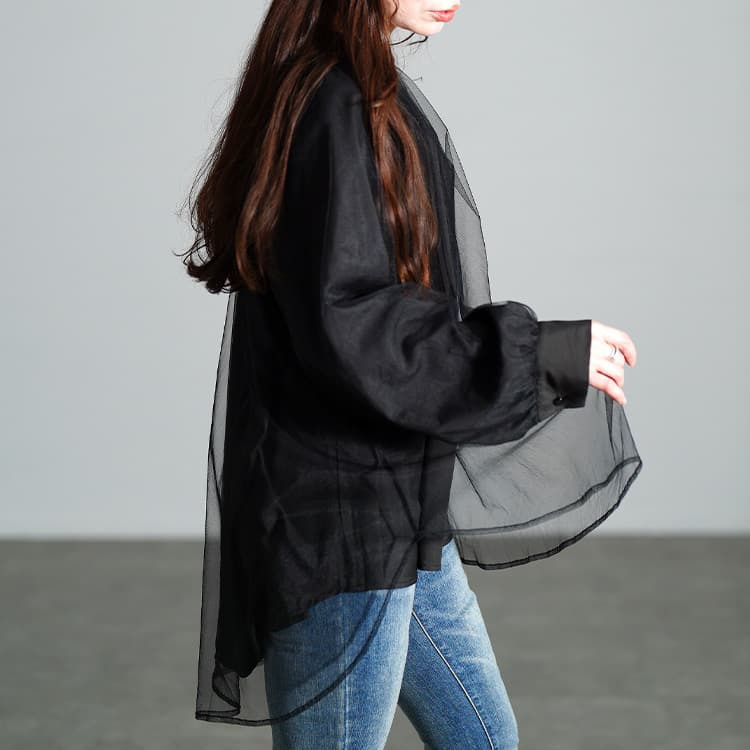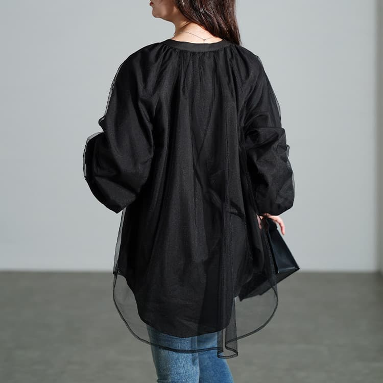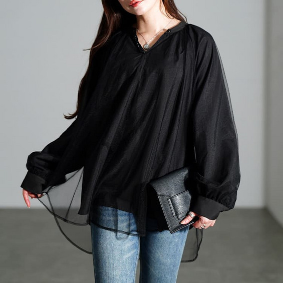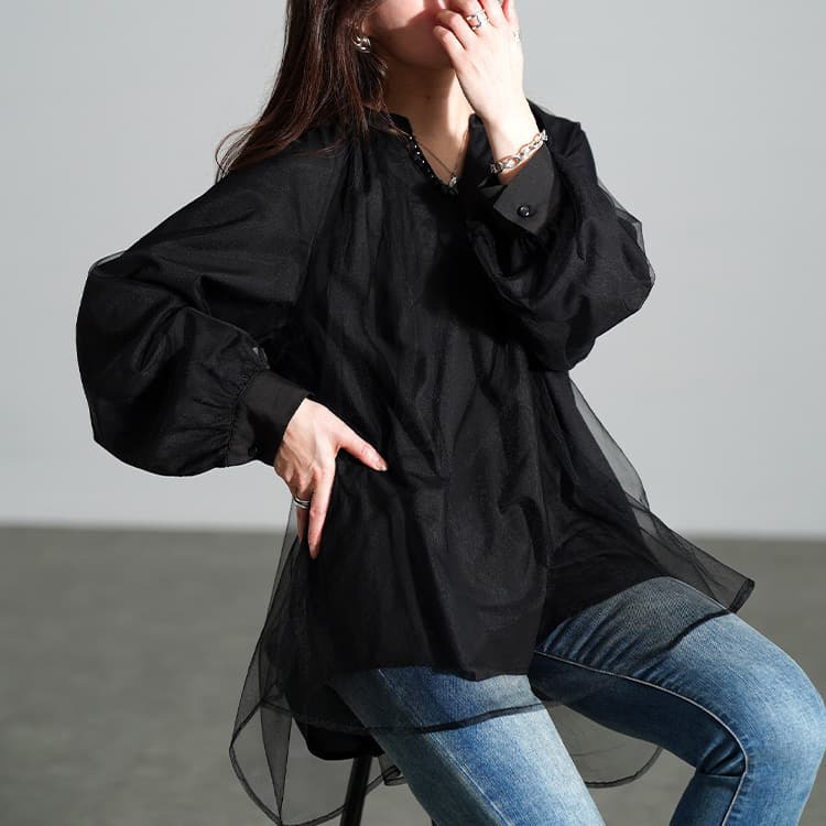 動くたびにふわっと揺れる軽やかな透け感が、ブラックでも重たく見せず、抜け感をプラスしてくれます。