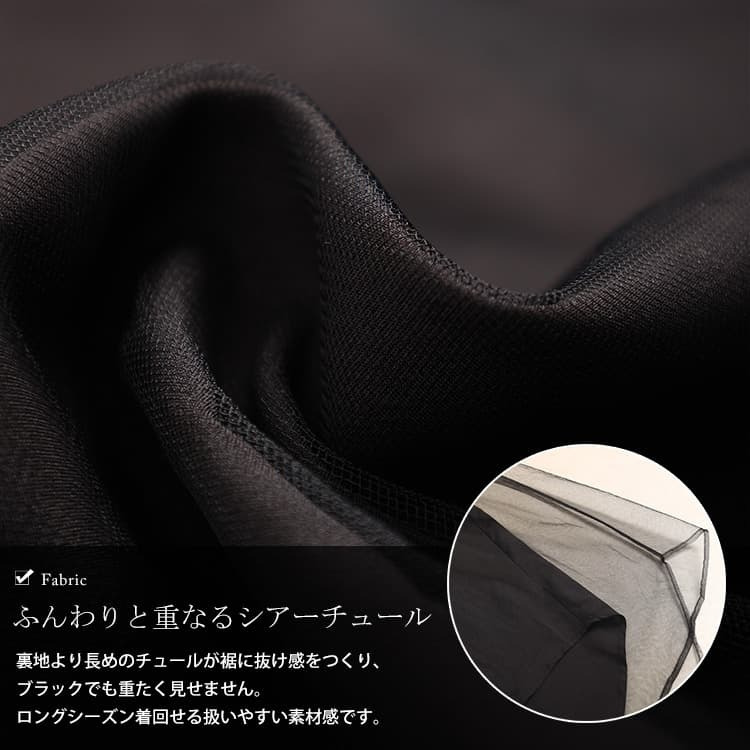 裏地より長めのチュール裾が軽やかに透け、重たくなりがちな秋冬コーデにも抜け感を演出します。