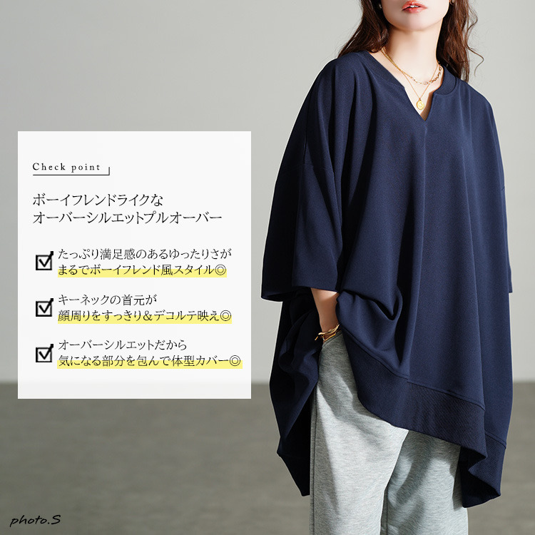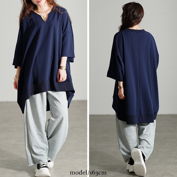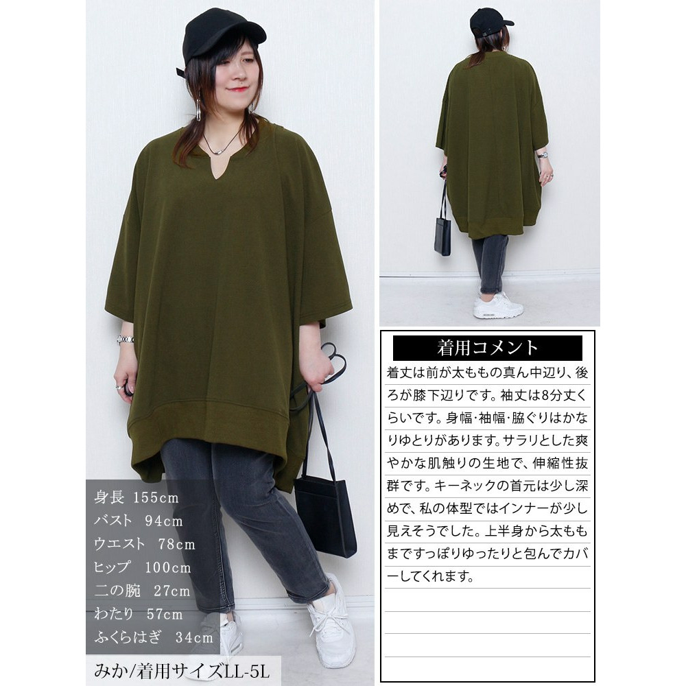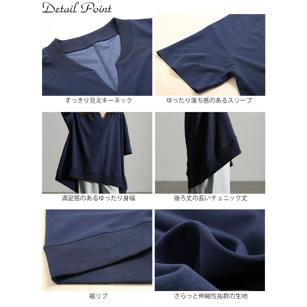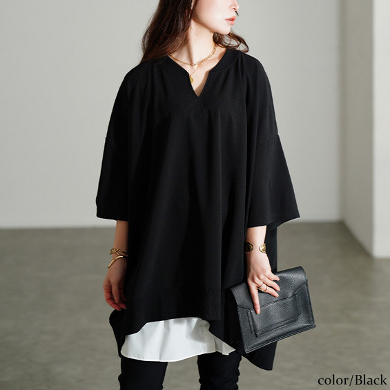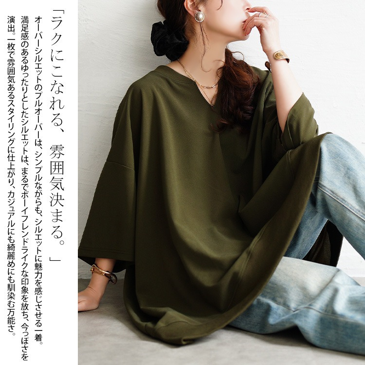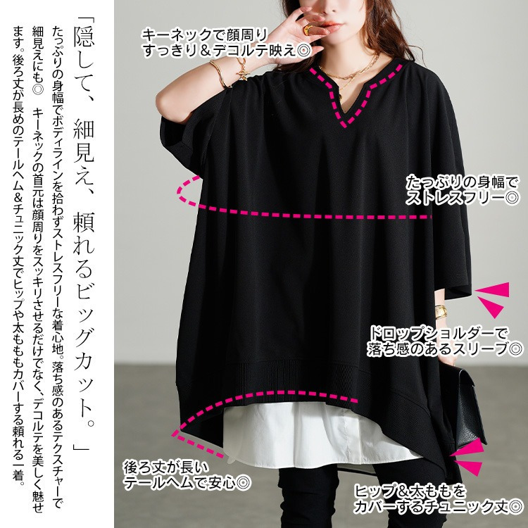 たっぷりの身幅でボディラインを拾わずストレスフリーな着心地。落ち感のあるテクスチャーで細見えにも。キーネックの首元は顔周りをすっきりさせるだけでなく、デコルテを美しく魅せます。後ろ丈が長めのテールヘム&チュニック丈でヒップや太もももカバーする頼れる一着。