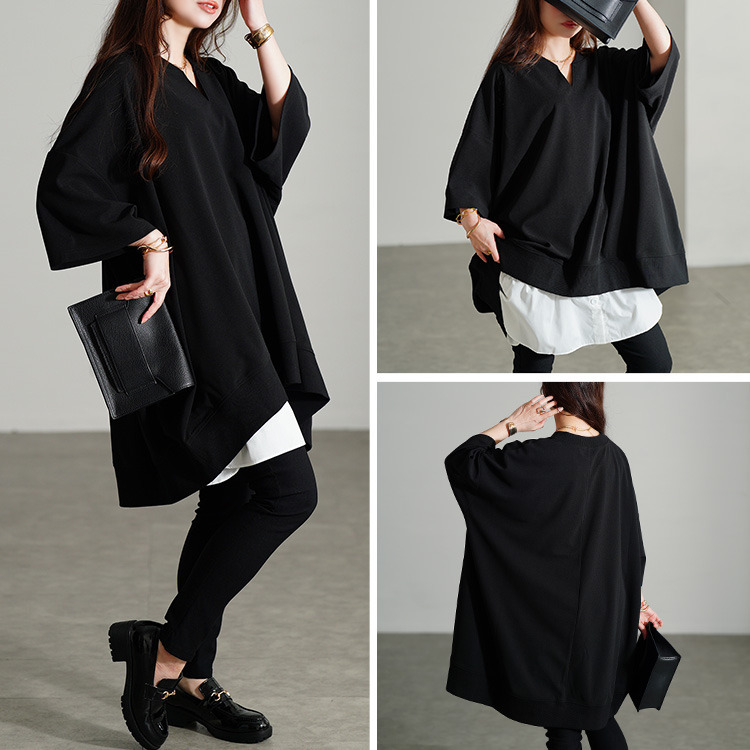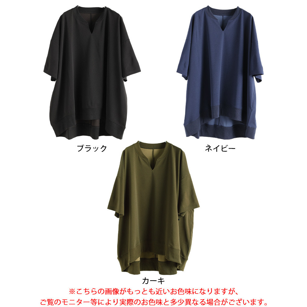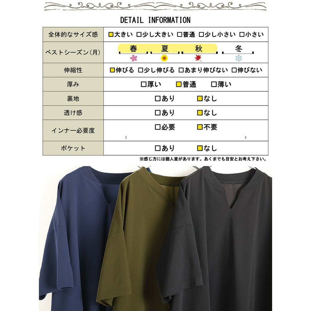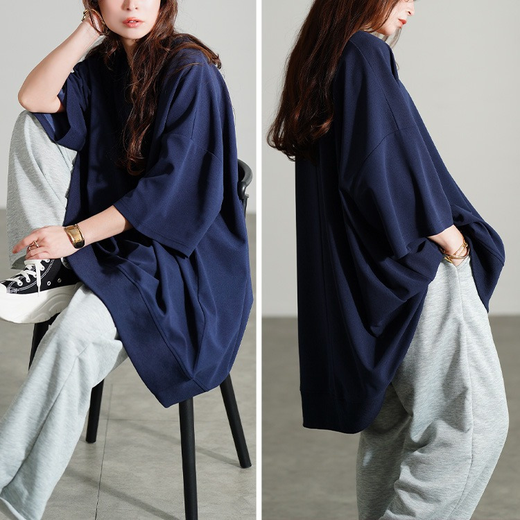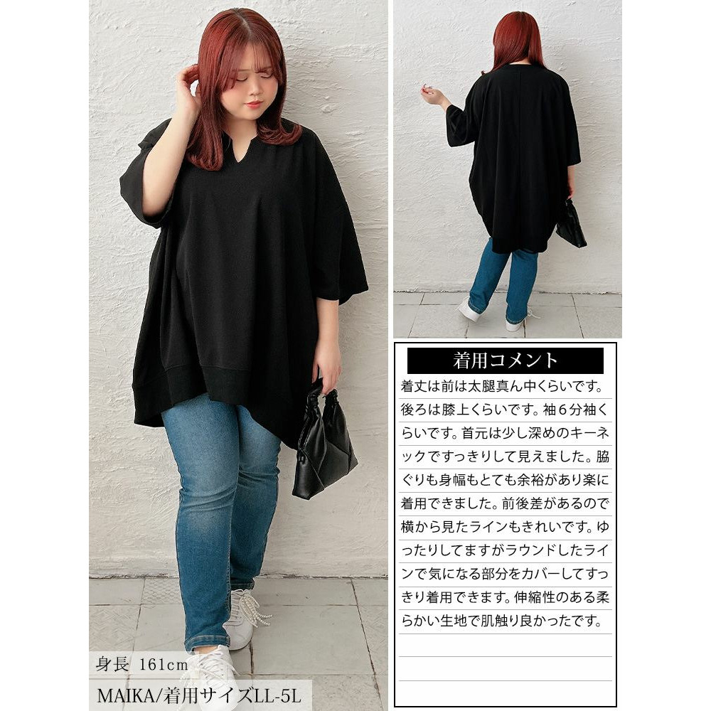たっぷりの身幅でボディラインを拾わずストレスフリーな着心地。落ち感のあるテクスチャーで細見えにも。キーネックの首元は顔周りをすっきりさせるだけでなく、デコルテを美しく魅せます。後ろ丈が長めのテールヘム&チュニック丈でヒップや太もももカバーする頼れる一着。