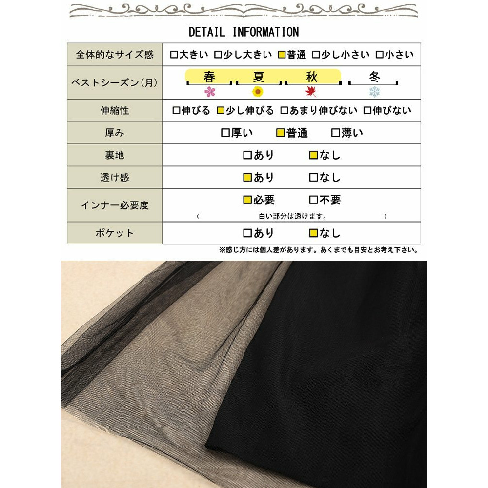 | 素材 | 本体:ポリエステル 100% 裏地:ポリエステル 70% ナイロン 30% チュール:ポリエステル 100% |