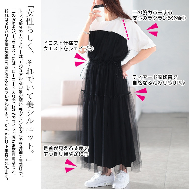 トップ部分のカットソーは、カジュアルな印象が漂い、ラグラン&安心の5分袖で肩まわりや、二の腕をカバー。ウエストにはドローコード入りでお好みのフィット感に調節可能なうえ、絞ればメリハリ&脚長効果に。落ち感のあるフレアシルエットがふんわり下半身を包みます。