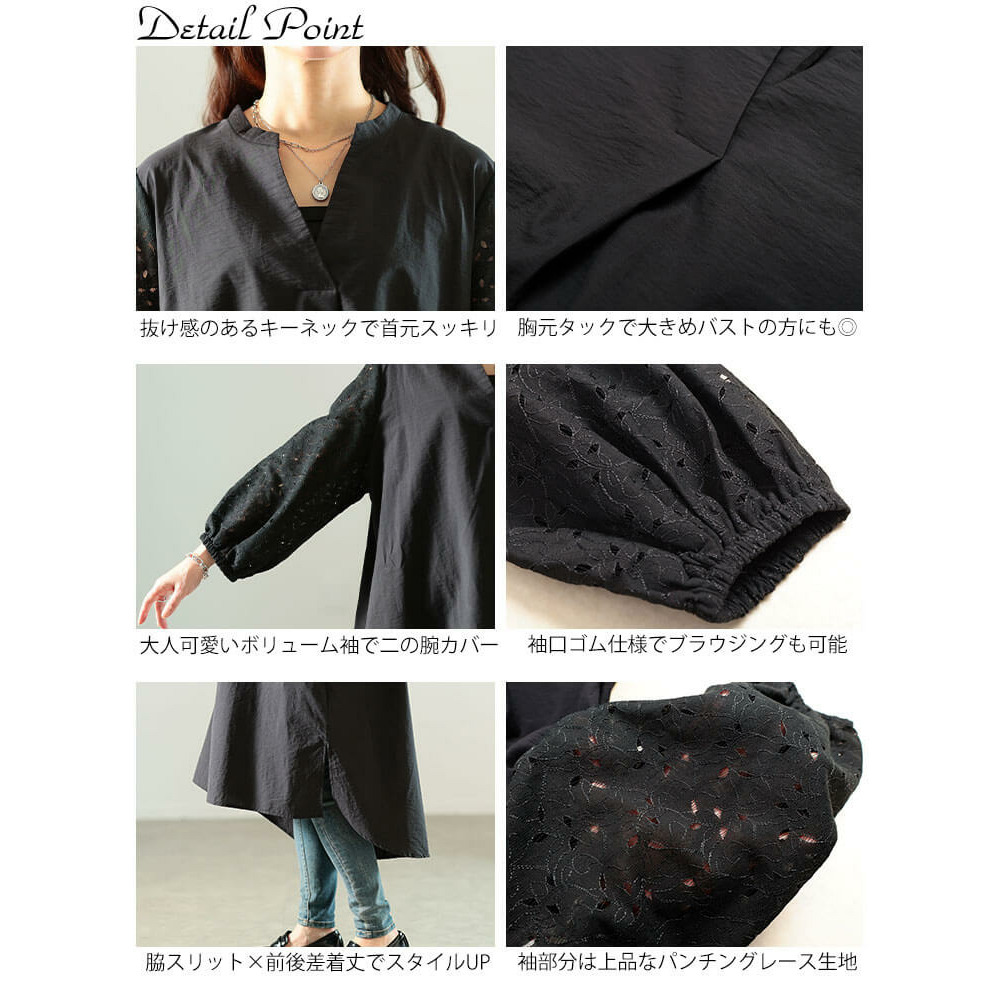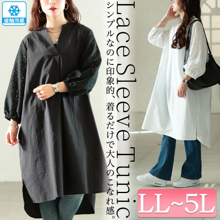 大きいサイズ レディース 接触冷感レース袖切り替えタックチュニック