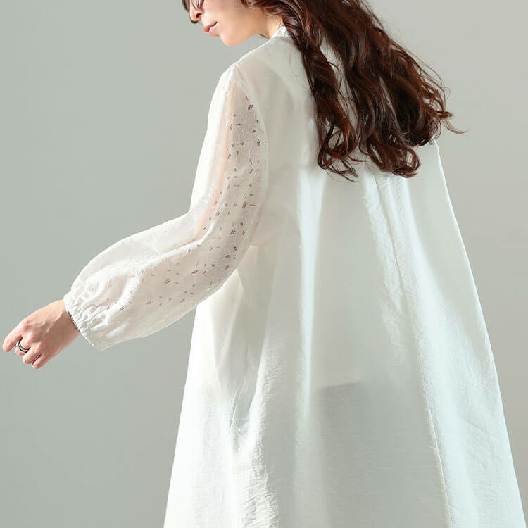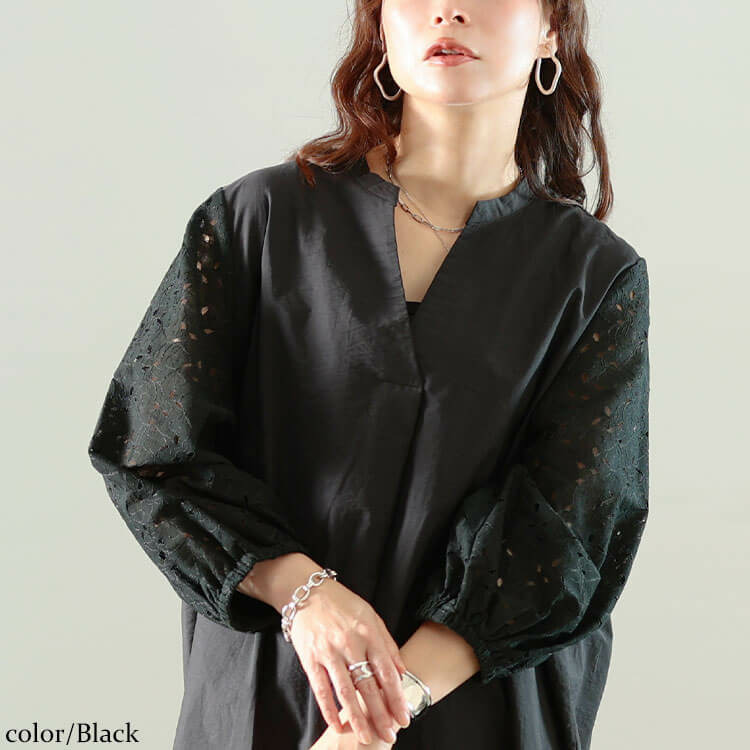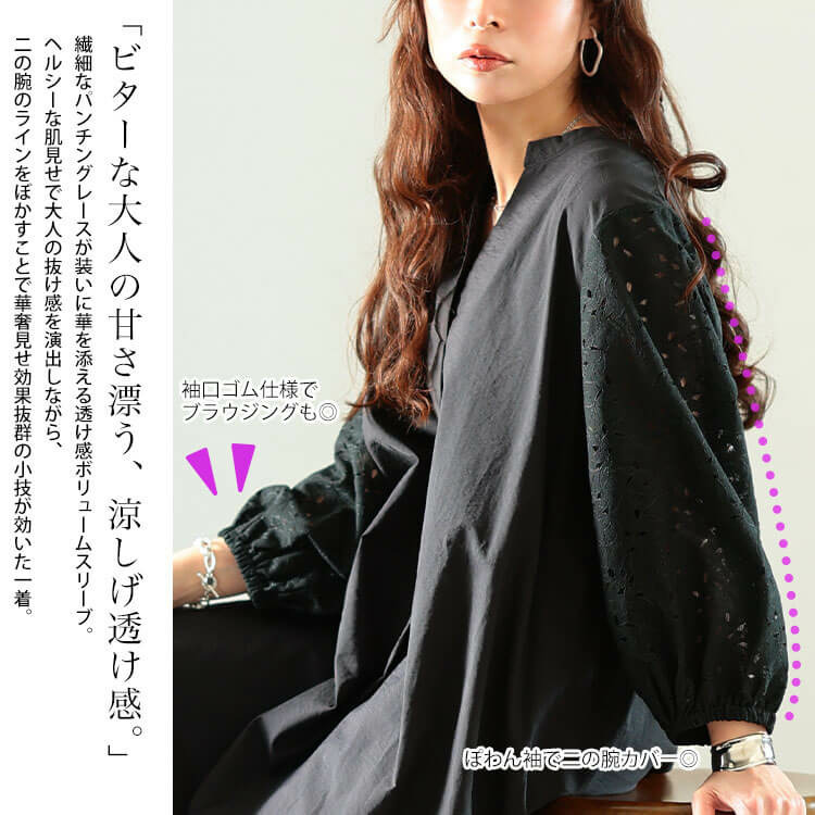 繊細なレースが装いに華を添える透け感ボリュームスリーブでお洒落に二の腕をカバー◎
