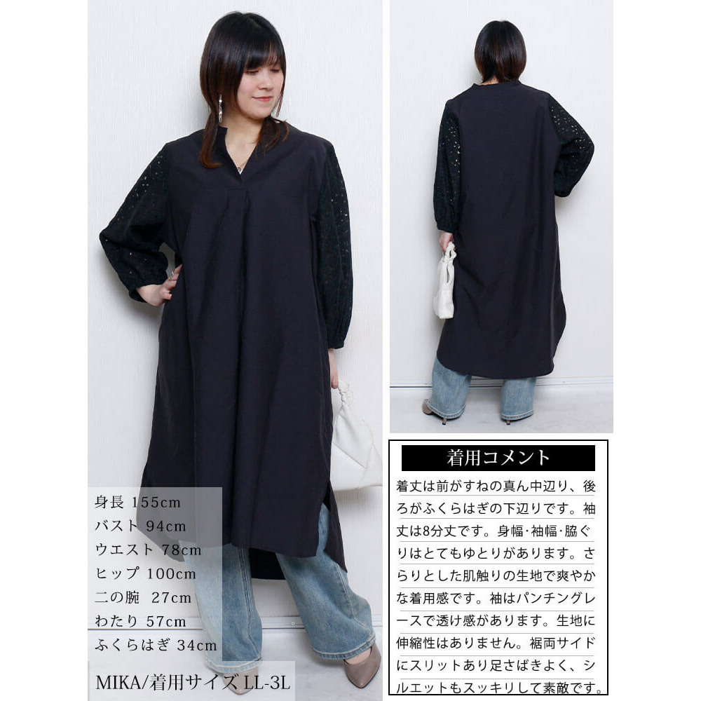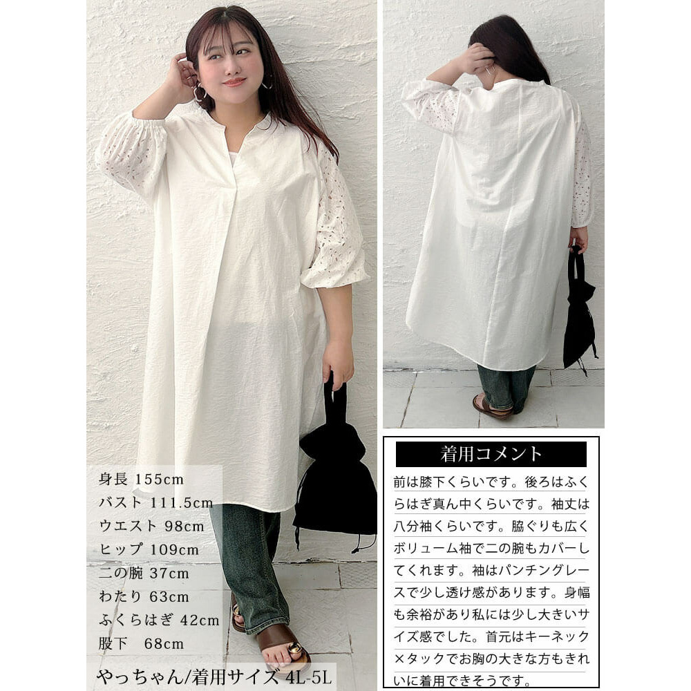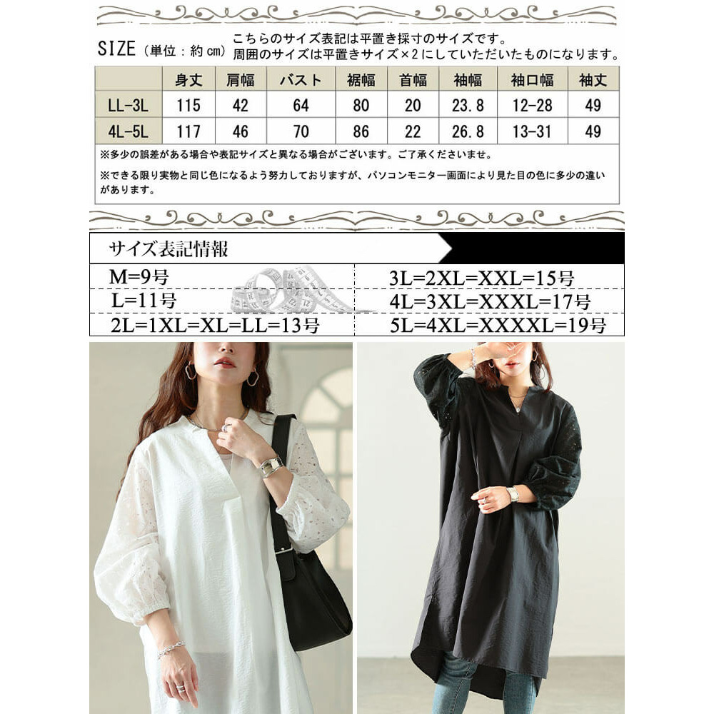 サイズ表記 LL-3L 4L-5L 身丈 115cm 117cm 肩幅 42cm 46cm バスト 64cm 70cm 裾幅 80cm 86cm 首幅 20cm 22cm 袖幅 23.8cm 26.8cm 袖口幅 12-28cm 13-31cm 袖丈 49cm 49cm