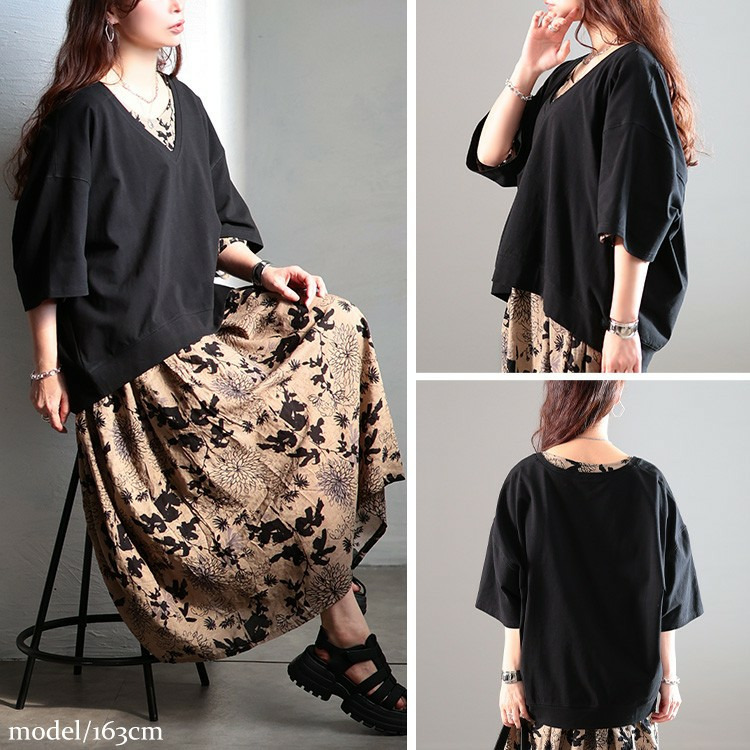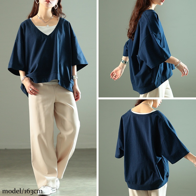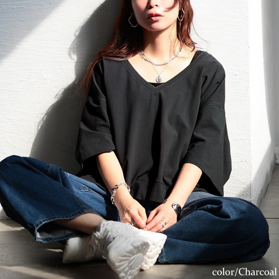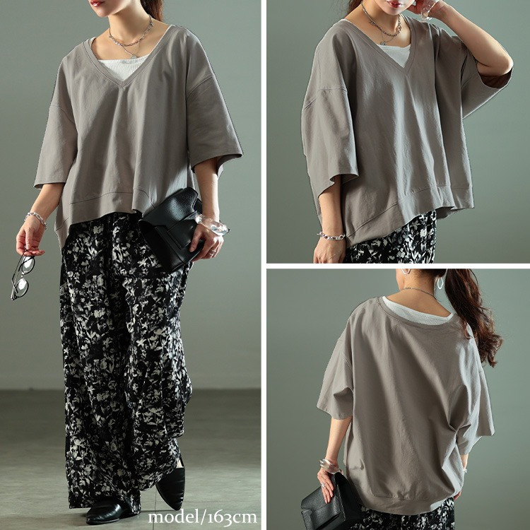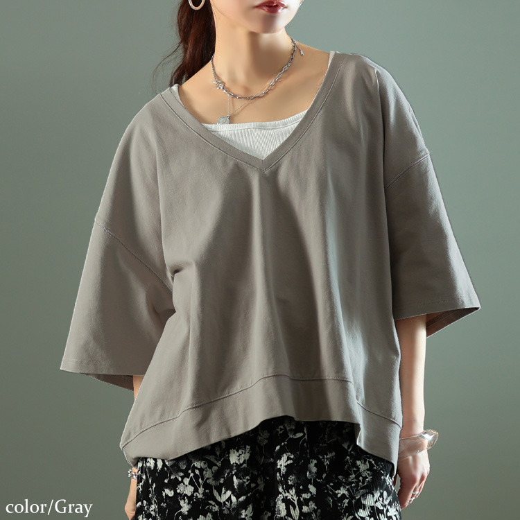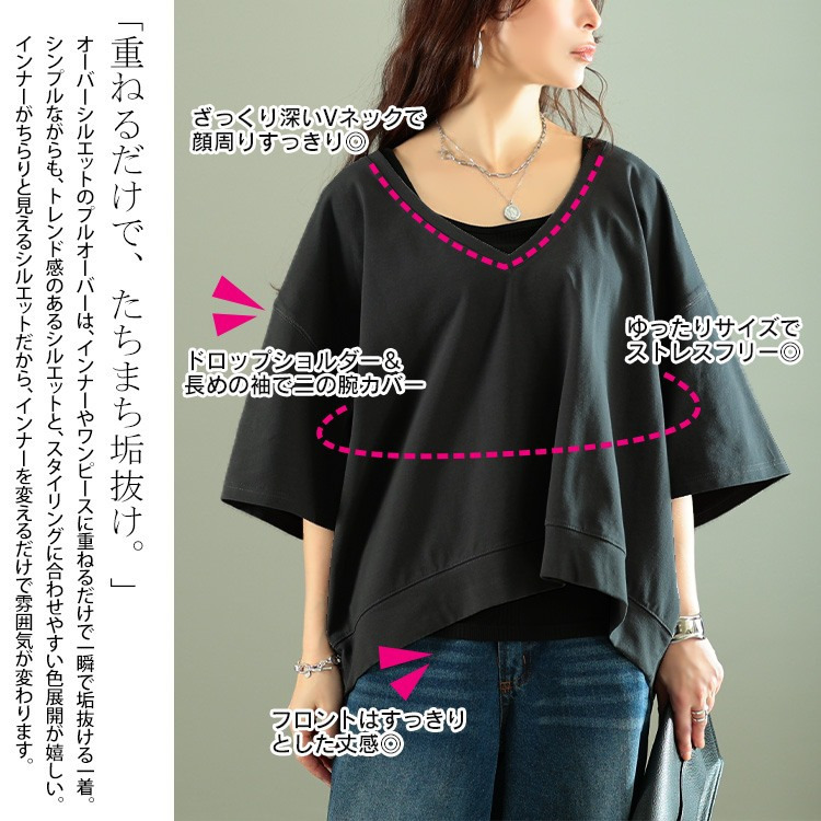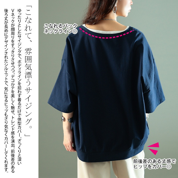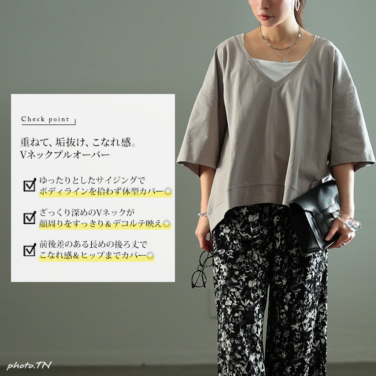 ゆったりとしたサイジングで、ボディラインを拾わず着るだけで体型カバー。ざっくりと深いVネックが顔周りをすっきりさせつつ、デコルテを美しく魅せ、トレンド感を演出。前後差のある後ろ丈が長めにデザインされたシルエットで、気になるヒップもさり気なくカバーしてくれます。