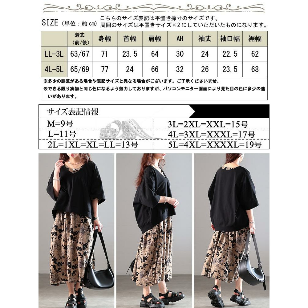 サイズ表記 LL-3L 4L-5L 着丈(前/後) 63/67cm 65/69cm 身幅 71cm 77cm 首幅 23.5cm 24cm 肩幅 64cm 66cm AH 30cm 32cm 袖丈 24cm 26cm 袖口幅 22.5cm 23.5cm 裾幅 62cm 68cm