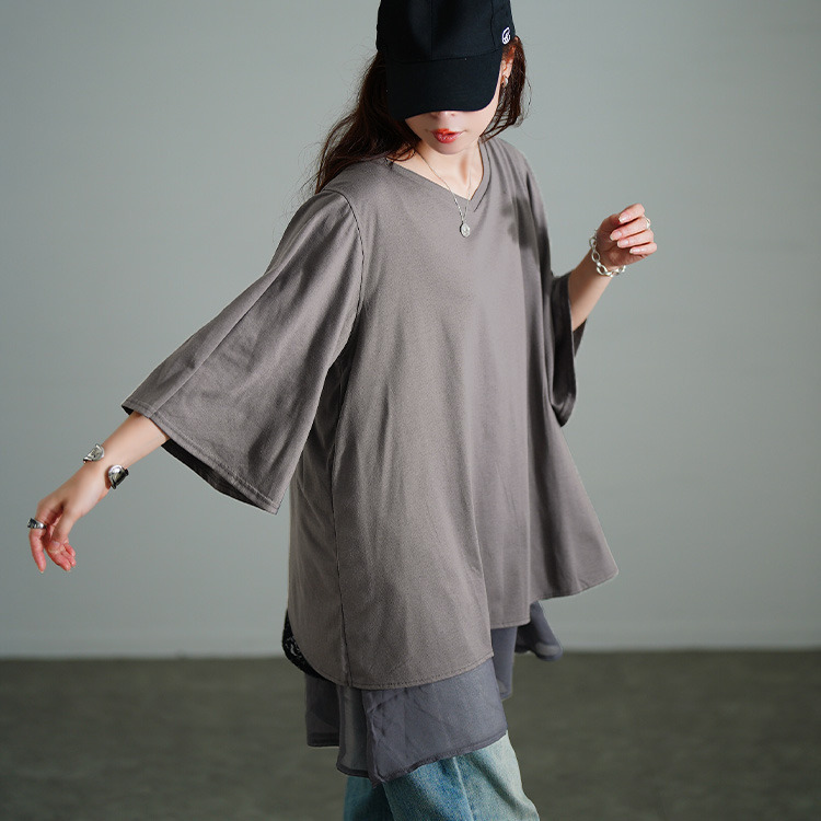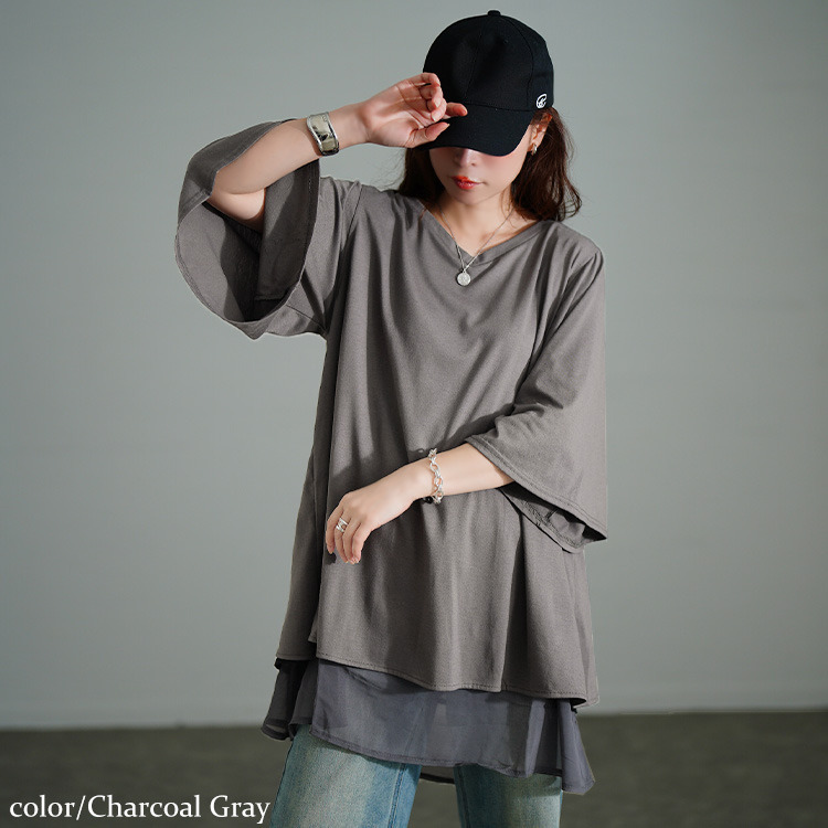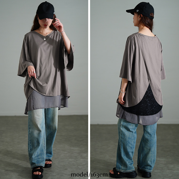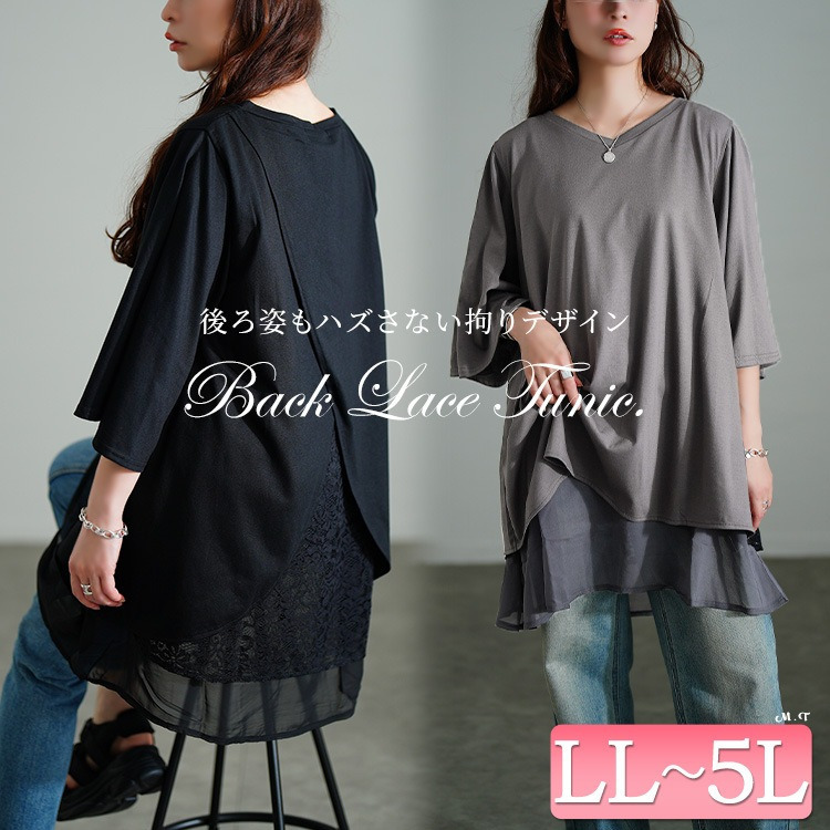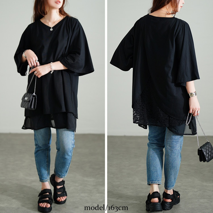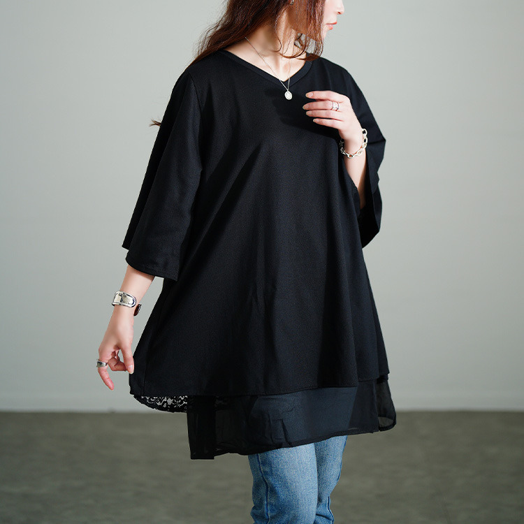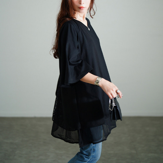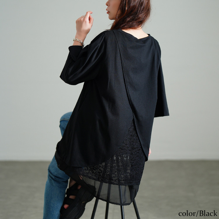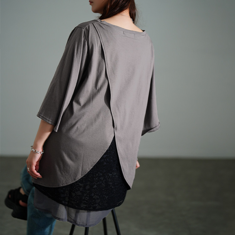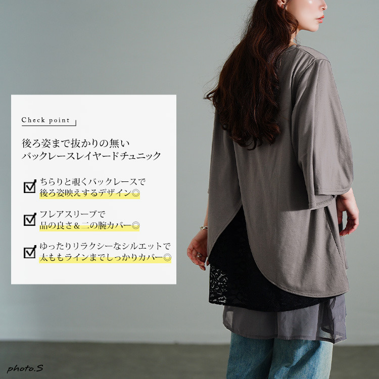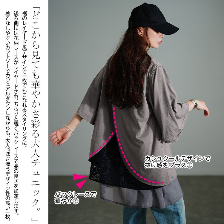 裾のレイヤード風デザインで一枚でもこなれるスタイリングに仕上がるチュニック。後ろ側には花柄レースがレイヤードされ、ちらりと覗くバックレースで品の良さを加速します。着こなしやすいカットソーでカジュアルダウンしながらも、大人っぽさ漂うデザイン性の高い一枚。